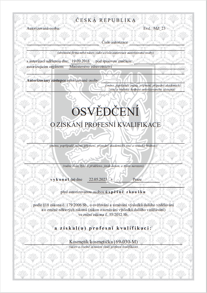 A Cseh Köztársaság Oktatási Minisztériuma által akkreditált licencet (Akreditované MŠMT České Republiky) valamennyi európai országban elismerik. Ez azt jelenti, hogy széles körű foglalkoztatási lehetőségekkel rendelkezik, és az Európai Unió bármely országában dolgozhat. Az ajánlólevél jelentősen növeli versenyképességét az amerikai piacon, és hozzáférést biztosít a világ egyik legnagyobb tetoválási piacához.