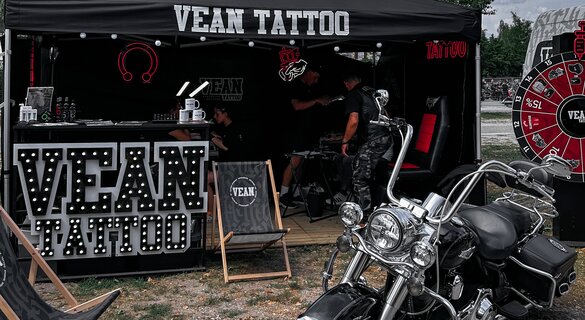 A VEAN TATTOO saját standja igazi látványosságként emelkedett ki a fesztivál kavalkádjából. Az időjárás szeszélyei ellenére művészeink megállás nélkül dolgoztak – az érzelmek, a zene és az emlékek fekete tintával kerültek a látogatók bőrére. Négy nap alatt több száz egyedi tetoválás született – a kedvenc zenekarok szimbólumaitól a misztikus motívumokig és vad koponyákig.