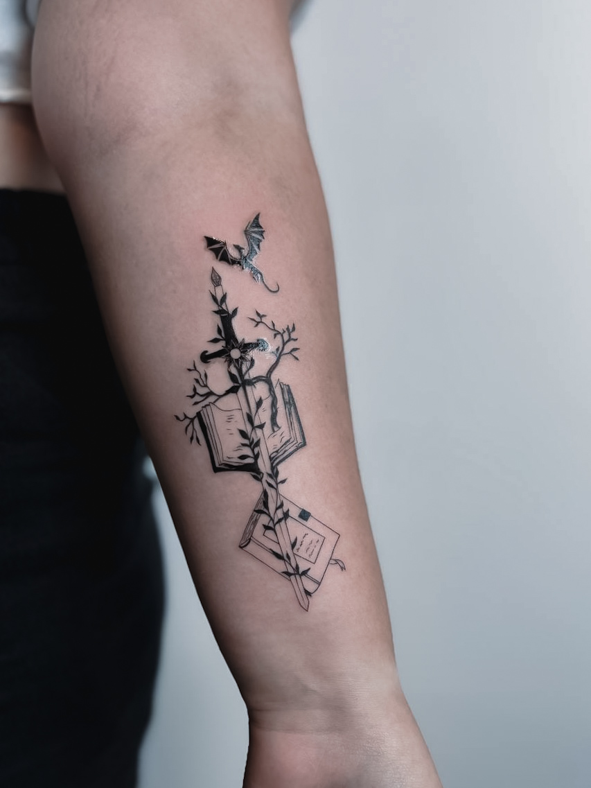 #Kard #Tetoválás #Tetoválás a kézen #Szép vonal #Könyv #Egy könyvet karddal