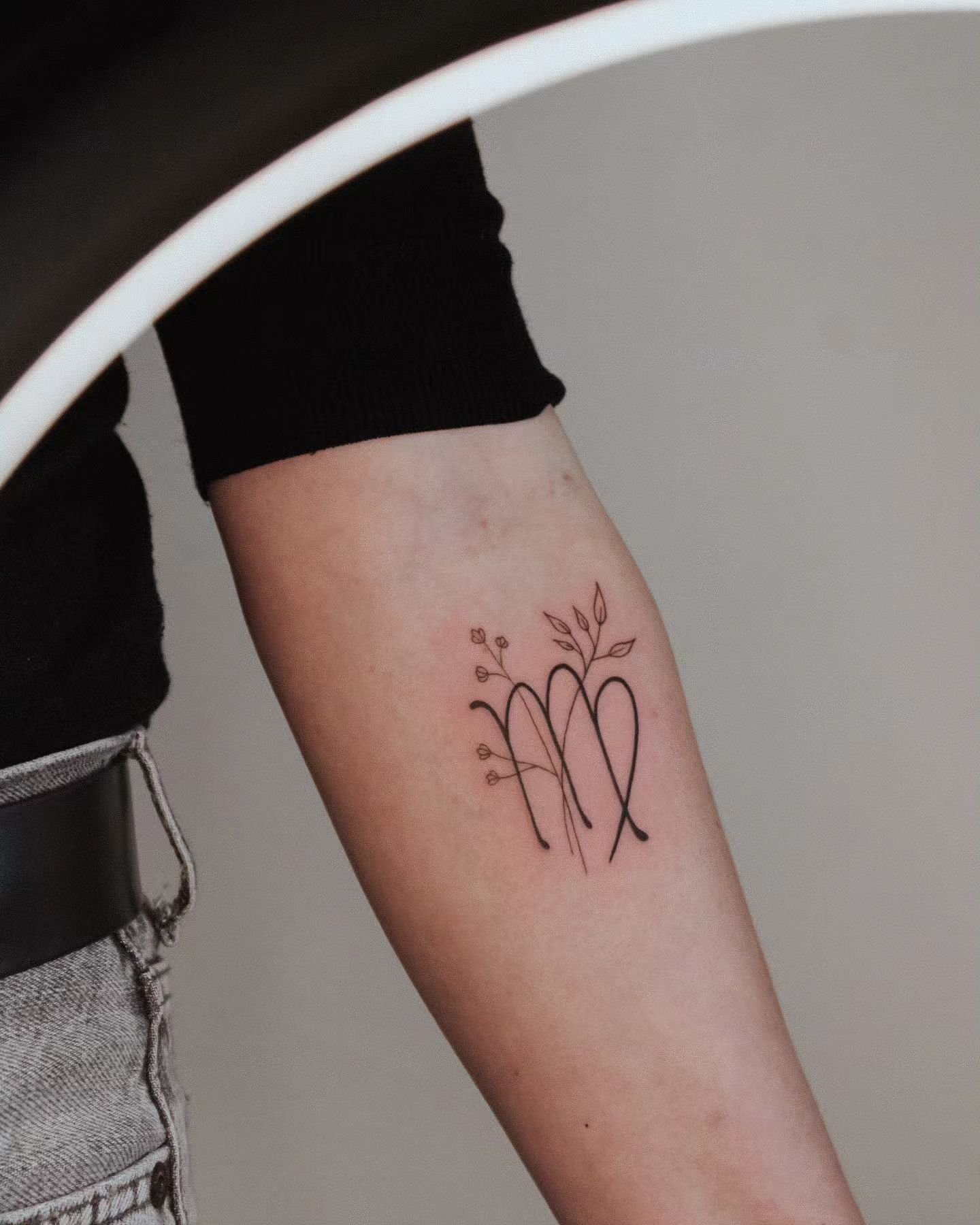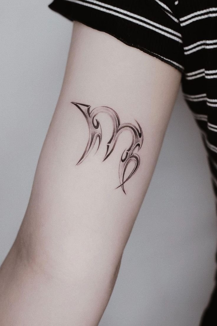 - Zodiákus jelkép: A latin "M" betű egy adott farokkal a Szűz szimbóluma, amelyet gyakran használnak a Szűz állatöv jel tetoválásánál. Ez a jelkép a vizet jelképezi, és minden élőlény kezdetét jelenti;