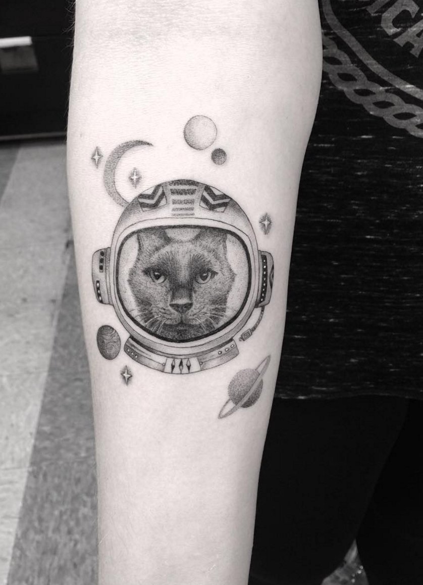Az űrhajós tetoválás egy kis állat formájában, élénk színekben és akvarell tetoválás stílusban - remek választás a kreatív lányok számára.