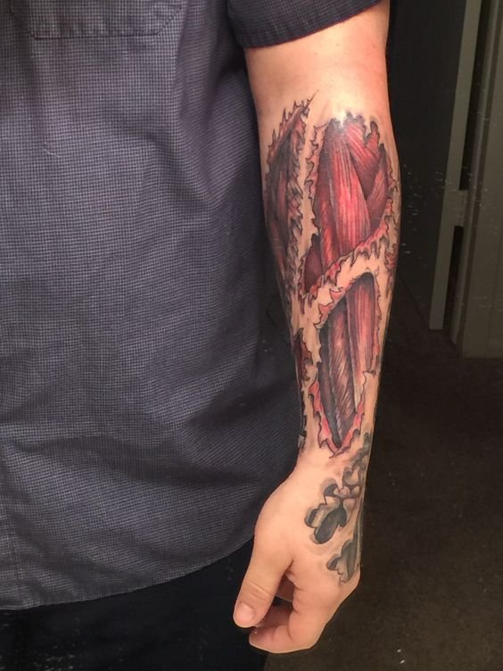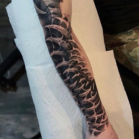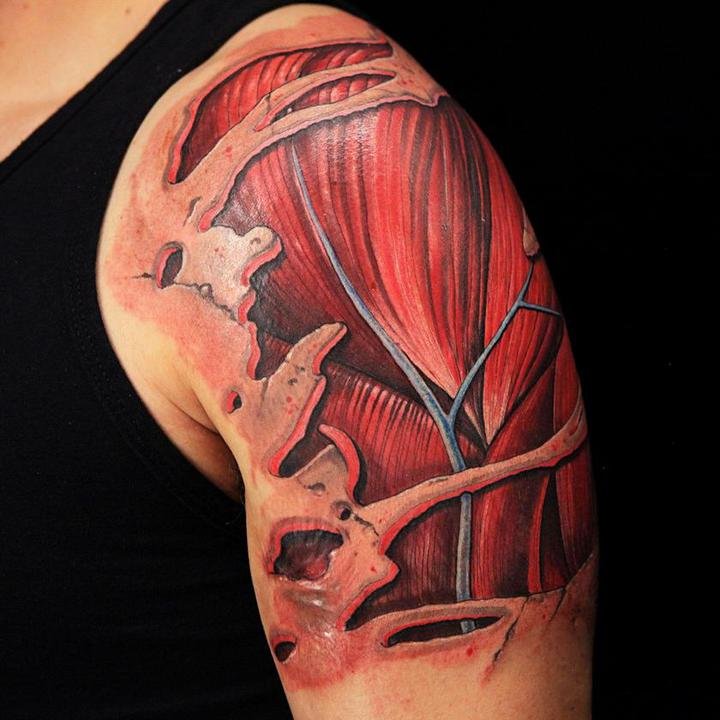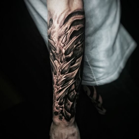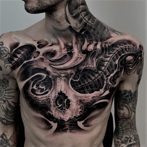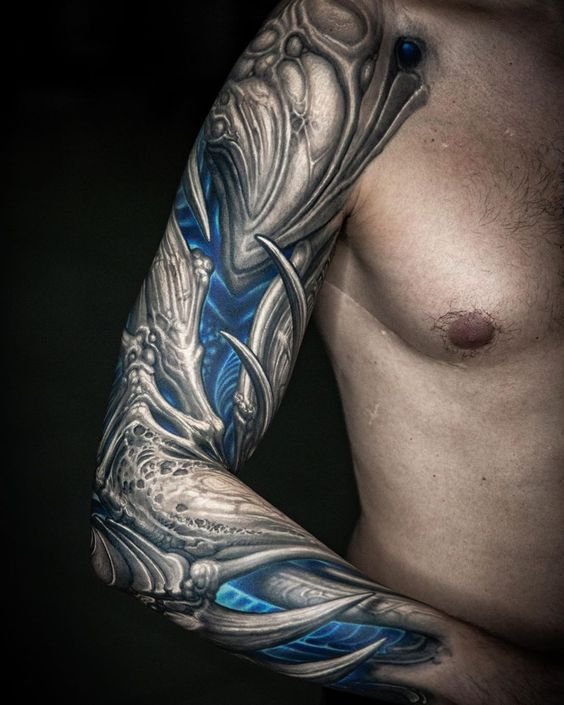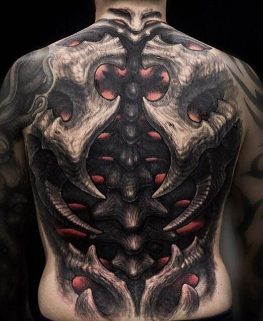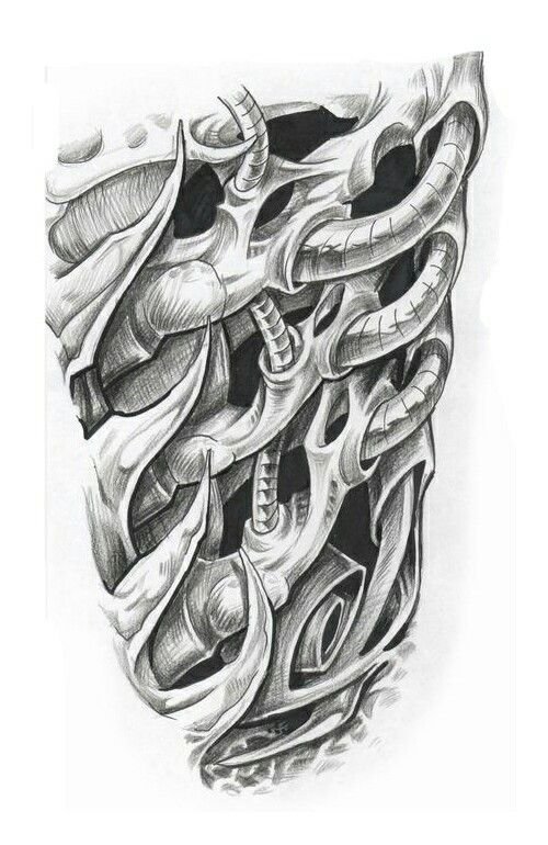 Megfelelő helyek a bio-organikus tetoválások felvitelére.Leginkább a "Bioorganic" stílusú tetoválások népszerűek a férfiak körében, mivel az ilyen művek komoran néznek ki a szakadt anyagok és a belőlük kiálló különféle elemek miatt.