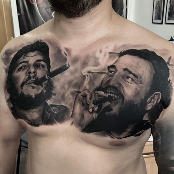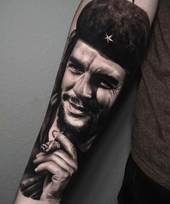 Che Guevara tetoválási vázlata a realizmus stílusában néz ki a legjobban. Ami a tetoválás egyediségét illeti, Ernesto bármelyik fotóját választhatja, mert a választás nem korlátozódik egyetlen, jól ismert portréra. Sok képen a Comandante jól ismert mondatai is szerepelnek.