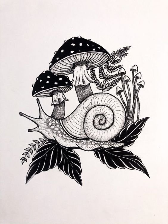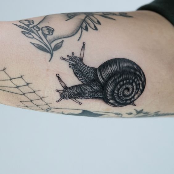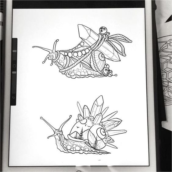 A csiga tetoválási vázlatát gyakran különféle elemekkel és mintákkal egészítik ki, teljes képet hozva létre. Ehhez a tetováláshoz tökéletesek az olyan részletek, mint a virágok, levelek, gyakran a kagyló helyett a mester egy kis házat ábrázol.