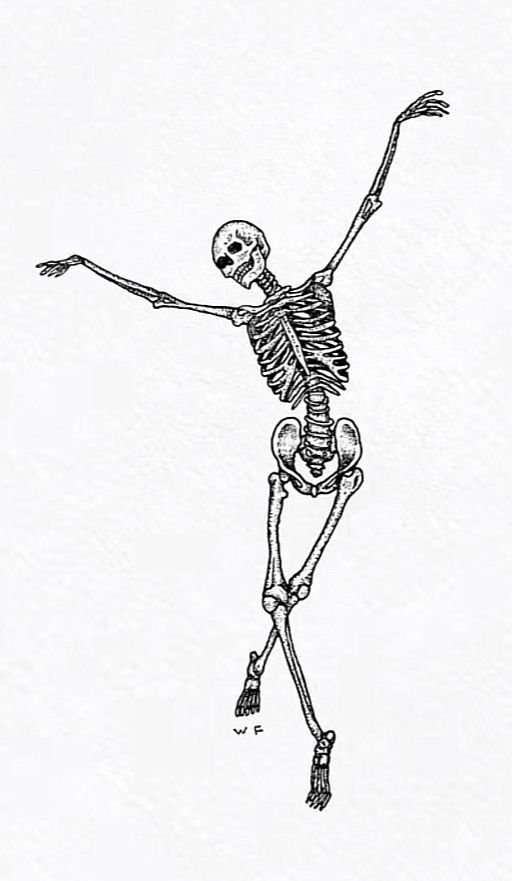 Szintén gyakran vannak vázlatok egy táncoló csontvázról, egy csontvázról kártyákkal vagy egy rózsáról a kezében.