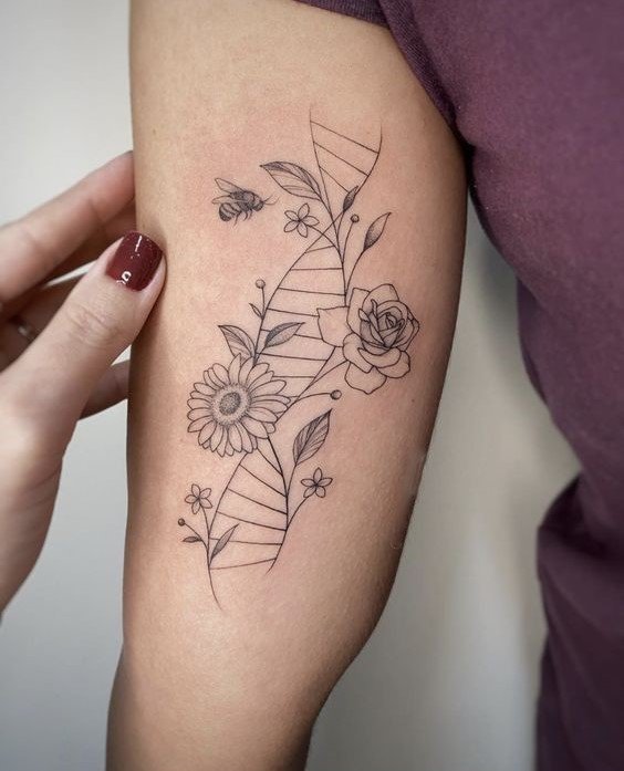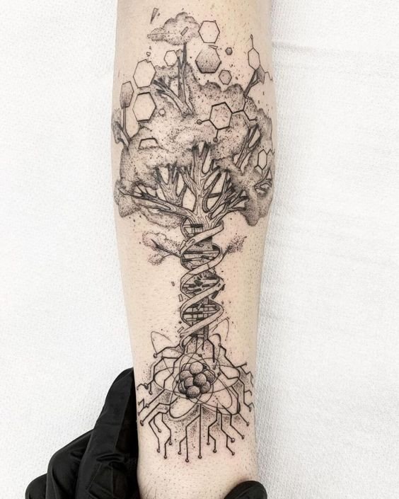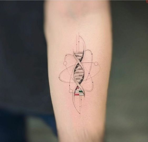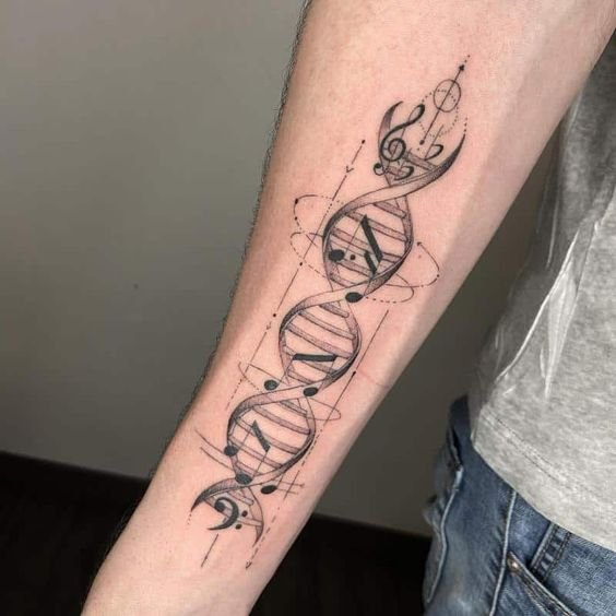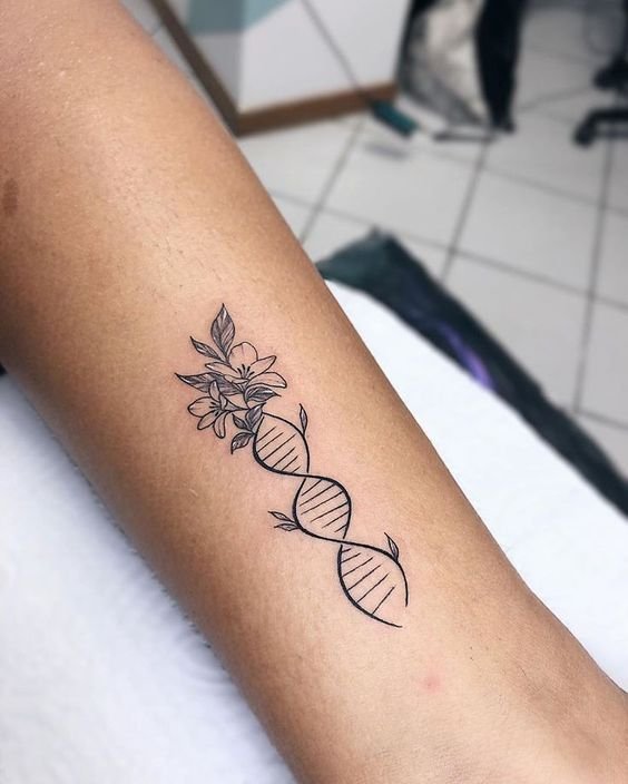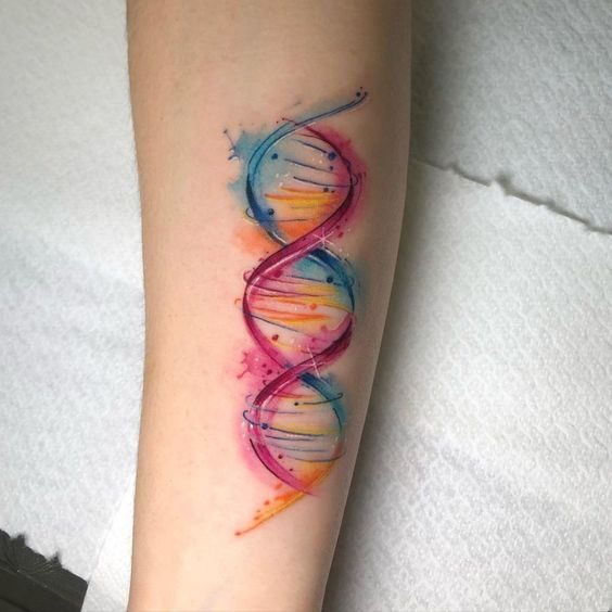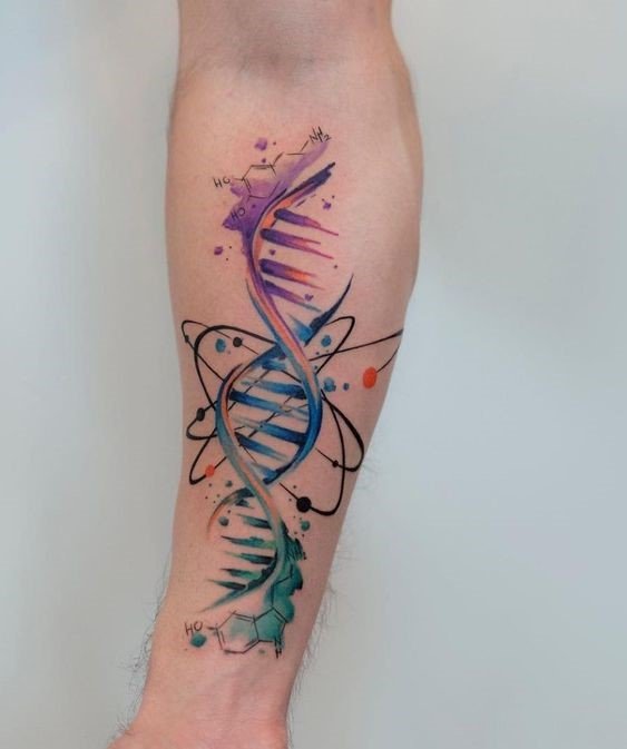 A tetoválás nagyon terjedelmes üzenetet hordoz. Több száz órát töltöttek el tudósok, állatok, akik részt vettek kísérletekben és gyönyörködés az emberi elme nagyszerűségében. A munkát gyakran olyan orvosok vagy hallgatók végezhetik, akik közvetlenül kapcsolódnak az orvostudományhoz és az emberi lényeg jelenségeinek tanulmányozásához, a tudósok arcát DNS formájában lehet ábrázolni, molekulák helyett elhelyezni. A tetoválást veszélyeztetett személyek is használhatják, és ebben az esetben maga a tetoválás tartalmazza a vércsoportra vonatkozó adatokat, valamint telefonszámot. Más elemek is bekerülhetnek a műbe, amelyek érdekesebbé teszik: ugyanazok az állatok vannak a spirál körül, és maga a spirál színes és fényes. Egészítse ki a munkát élénk színekkel, és most az unalmas tudomány átalakul, érdekesebbé és vonzóbbá válik. Szintén fontos a munka háttere, ami tárgyonként beállítható: lehetnek képletek, táblázatok, egyéb képek. A csavart spirál lehet, hogy nem az, keresztezheti a saját fajtáját, és nagyobb mintát alkothat, telítettebb. Emellett szavak, szimbólumok és számok is képezhetők a DNS-ből. A spirál körbetekerheti a kezet, ettől lesz teljes: ez a változat mutatja be a DNS és elemeinek lényegét.
