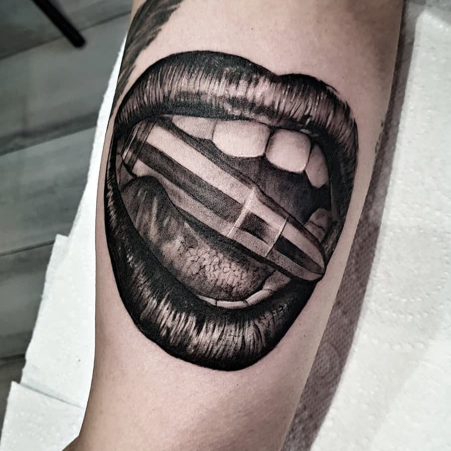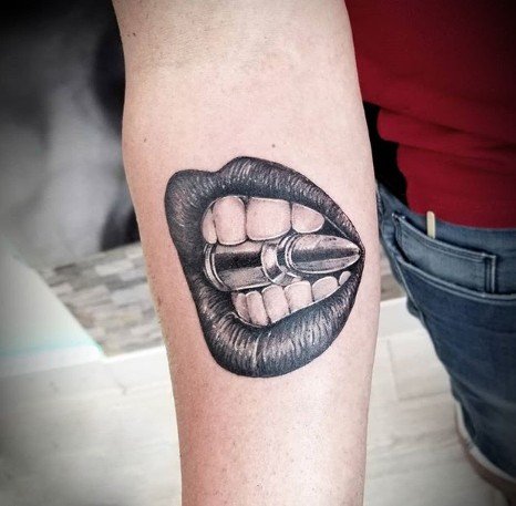 Szintén nagy kereslet van a lány szájában lévő golyóra, egy fegyverrel ellátott golyóra, vagy egy egész patronra. A kép nagyon eltérő lehet, a lényeg az, hogy a tetoválás tulajdonosát céltudatos, tisztességes és egyenes emberként jellemezze.