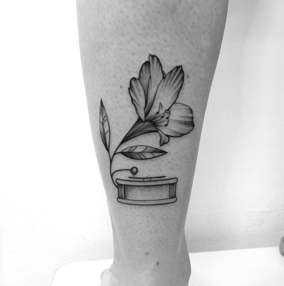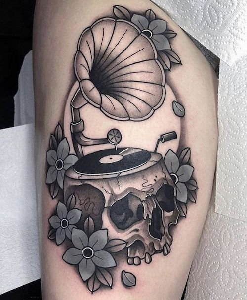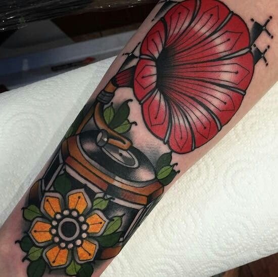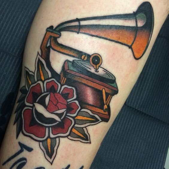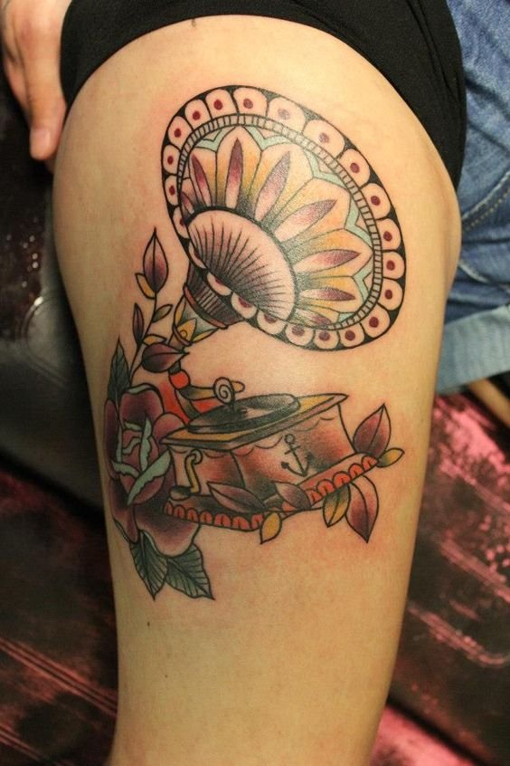 Ebben az esetben a gramofon tetoválás annak a személynek a belső világát jeleníti meg, aki a testére alkalmazta. Egy régi klasszikus készülék minden funkciójával rendelkezik, amely most divatos és aktuális.