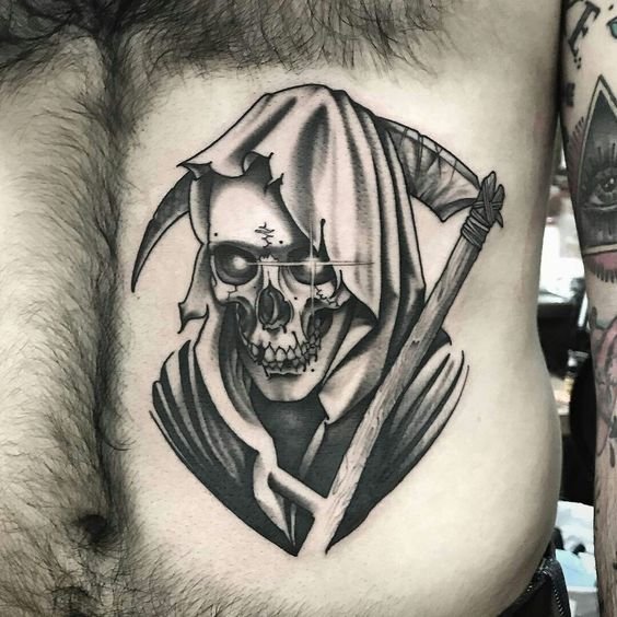 A kaszával való halál tetoválás az ember bátorságát képviselheti, így az egész világnak demonstrálja, hogy nem fél semmitől. Hiszen ha fél a haláltól, aligha választotta volna ezt a vázlatot tetováláshoz.