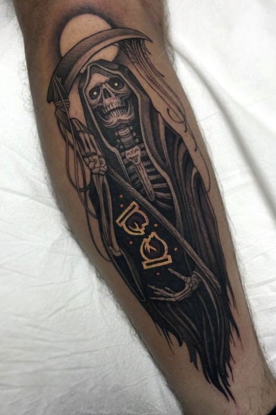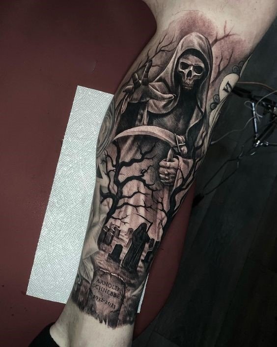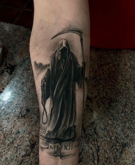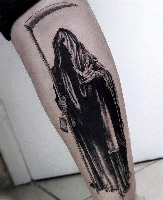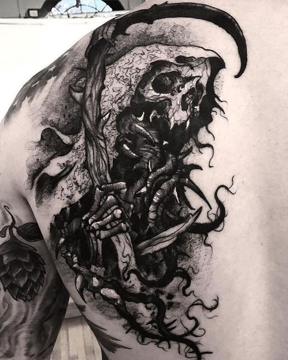 A kaszával való halál tetoválás testfelületének kiválasztásakor a legmegfelelőbbek a nagyméretű helyek: hát, mellkas, has, alkar, lábszár.