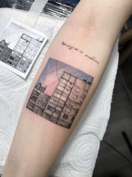 Egy tetoválás formájú városi ház elmondhatja nekünk, hogy az ember bármilyen otthont képes hangulatossá varázsolni. A városi munkák ritkábban fordulnak elő, és nem szabványos írással készülnek. Lehetnek a város hátsó udvarai, vagy a város, esetleg a világ legszebb épületei. Itt a szobrok kapnak szerepet, és az alkotás a környező hétköznapok unalmasságát és a magányos ablak fényét egyaránt átadhatja, a szeretet szimbólumaként, a szomorúság szimbólumaként.