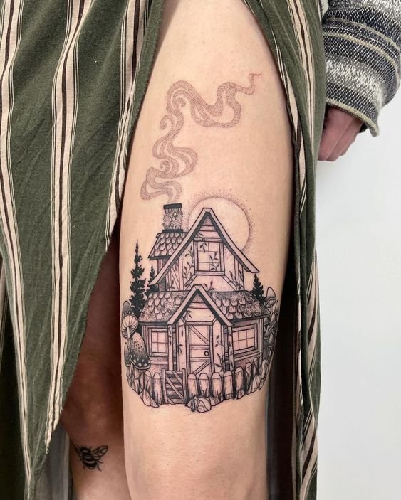 Teljesen más, mint a városi felhőkarcolók, hiszen kényelmesebb, csendesebb és természetközelibb. Azok, akiknek rokonai vannak falvakban és városokban, tudják, milyen jó néha ezen a civilizációtól mentes helyen tartózkodni, ahol a rokonokkal való meleg kommunikáció felvidít, lehetővé teszi, hogy megszabaduljon a problémáktól és a rutintól.Az erdei ház sok férfi álma, de nem kevésbé vonzza a nőket is. A vele készült tetoválás azt jelenti, hogy vágynak eltávolodni a nagyváros zajától, elmélkedni az életről, álmodozni. A házat ábrázoló tetoválás választás lesz az elzárt egyének, valamint azok számára, akik élvezik a magány kényelmét. Egy ilyen ház végre lehetővé teszi, hogy megírhass egy olyan könyvet, amely már régóta megragadt a fejedben, vagy egy képet, aminek körvonala segítséget jelenthet egy tetováláshoz.