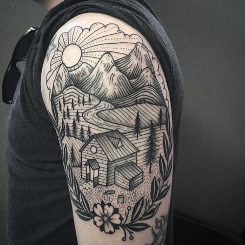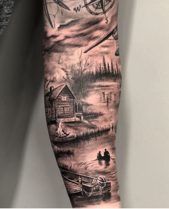 Egy vidéki ház azonnal kapcsolódik a nyárhoz és a szabadidőhöz. Kellemes emlékek ezek a pihenésről, az üzlettől és a munkától való szabadságról. Ide olyan elemeket lehet hozzáadni, mint a horgász, aki egy botra fókuszál, a munka díszíthető fákkal, virágokkal és növényekkel is, amelyek díszítik a tetoválást. A természet, a zöld és az állatok frissessége megkönnyíti és nem zavarja a munkát.