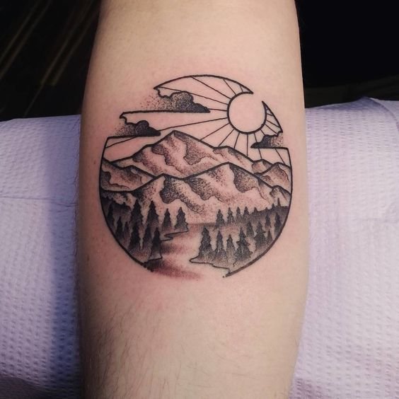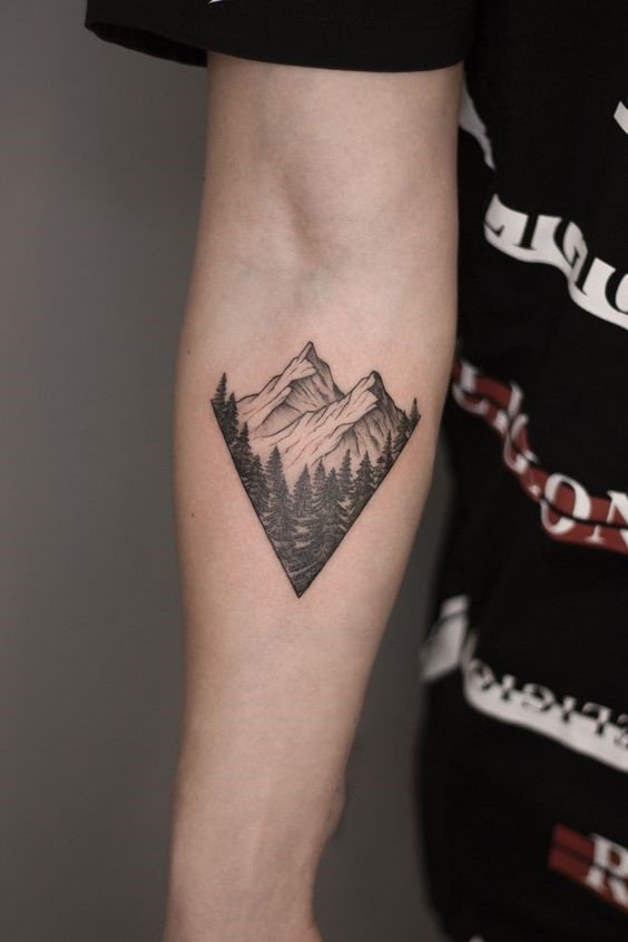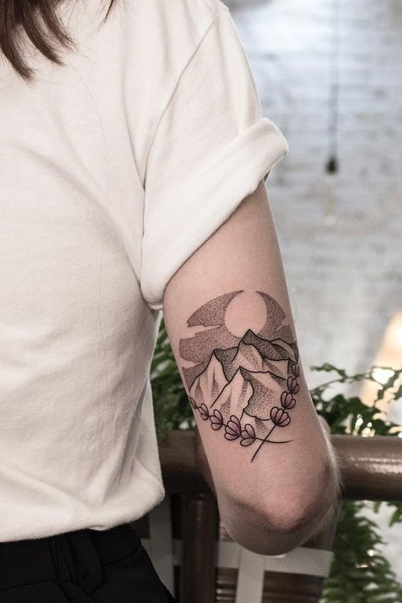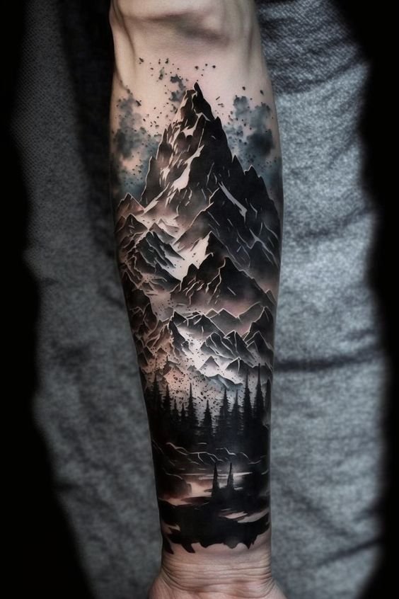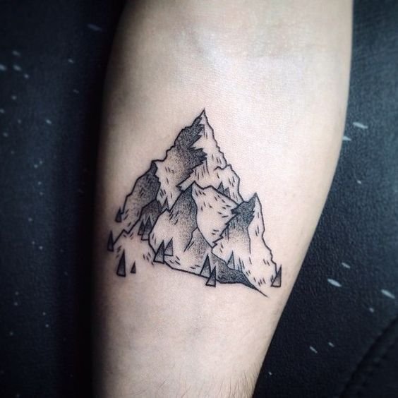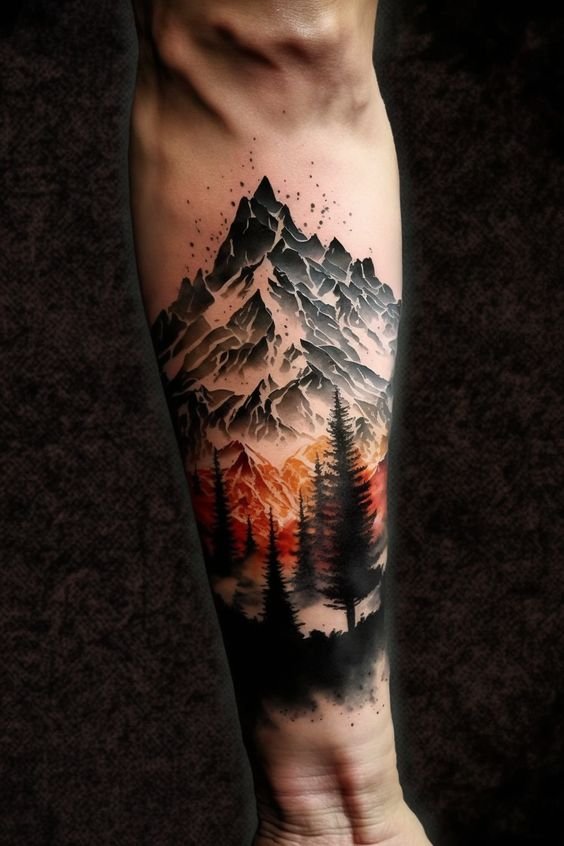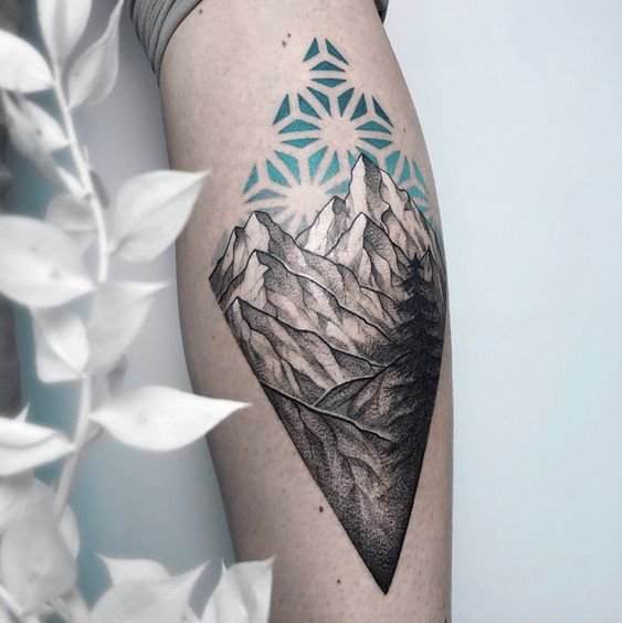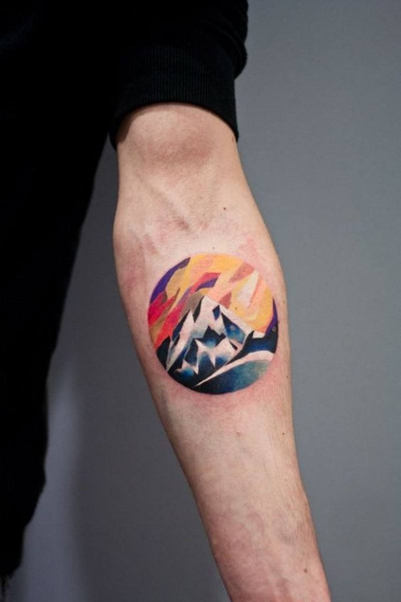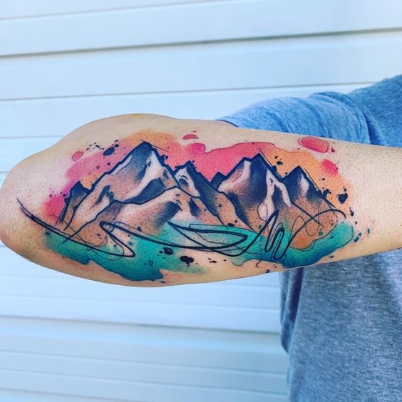 A hegyeket ábrázoló tetoválások sokféle stílusban és színben jól néznek ki.