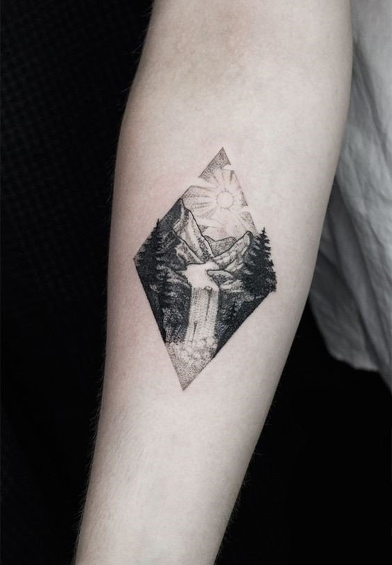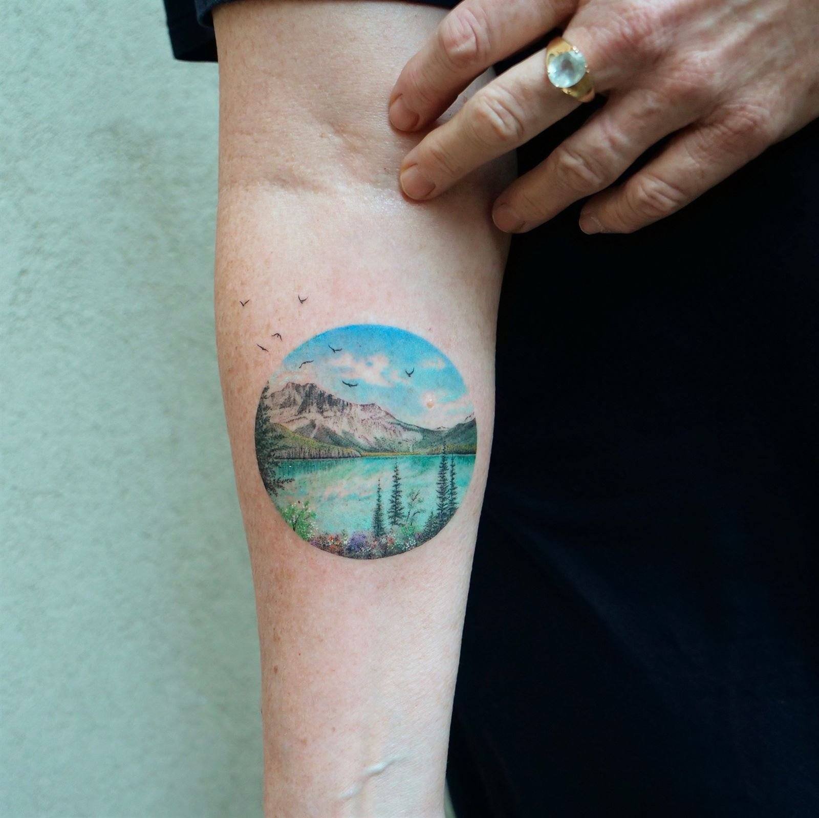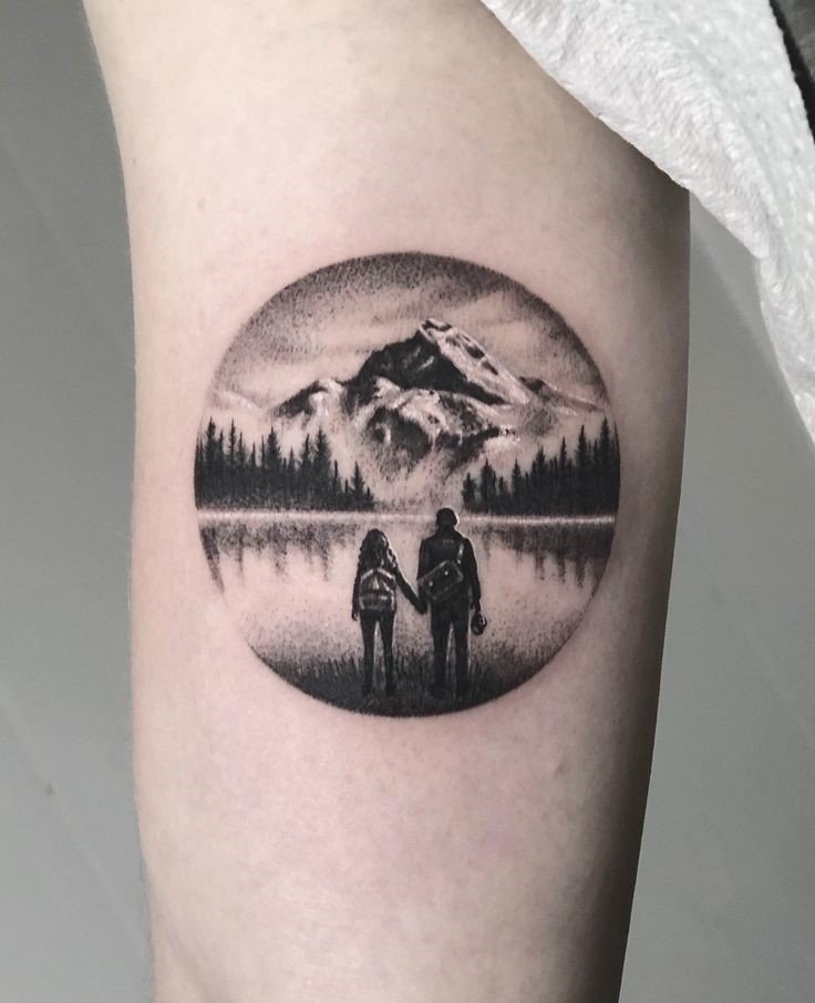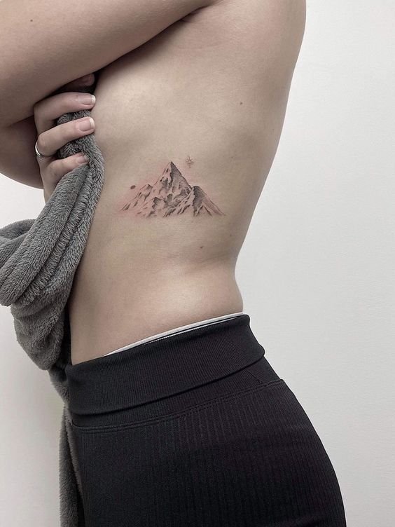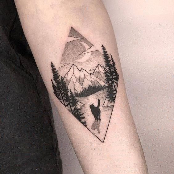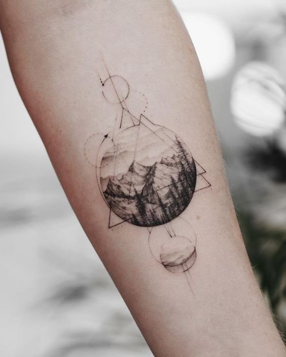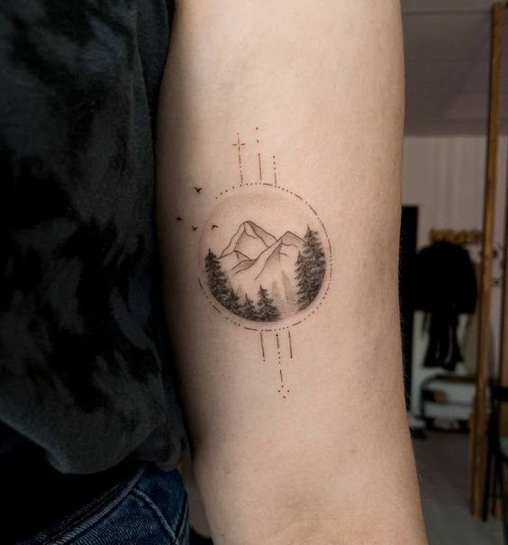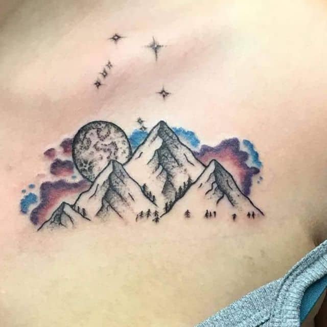 A hegyeket ábrázoló tetoválások sokféle stílusban és színben jól néznek ki.