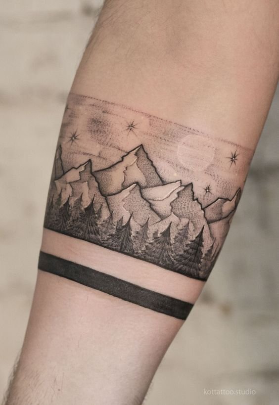 A férfiak, akik hegyeket választanak tetováláshoz, ezzel demonstrálják erejüket, hatalmukat, legyőzhetetlenségüket és bölcsességüket. Végül is, amint a szövegben már említettük, az ősidők óta az emberek hittek az istenek hegyeinek tetején és a földöntúli hatalmas lényekben. Például az Olümposz-hegy. A férfiak általában nagy, háromdimenziós hegyképeket választanak, hogy teljes mértékben demonstrálják erejüket.