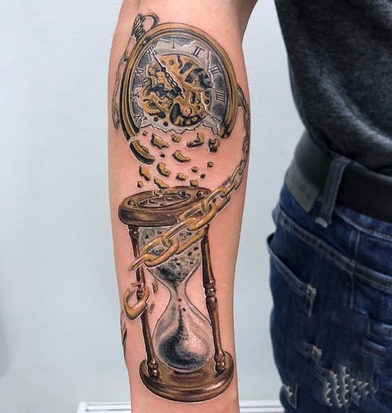 Gyakori az eltört órák mintája is. Az ilyen képek szomorúságot és csalódást hordoznak magukban, amelyek általában az élet mulandóságához kapcsolódnak. Vagy ez a tetoválás azt sugallja, hogy tulajdonosa nem akarja a semmire vesztegetni az időt, és arra törekszik, hogy gazdag életet éljen. Általában a törött homokórát egy olyan mondat egészíti ki, amely teljes mértékben felfedi a tetoválás lényegét.