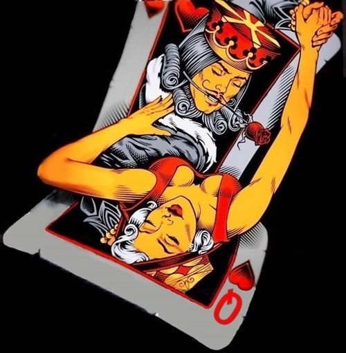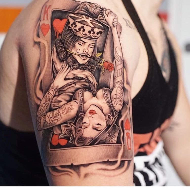 A kártyatetoválások gyakran páros tetoválásként működnek a szerelmesek számára. Ebben az esetben a férfi testén egy királykártyás tetoválás van, a másik felének pedig egy királynőt ábrázoló tetoválás. Ebben a változatban a kártyák színe általában a szív.