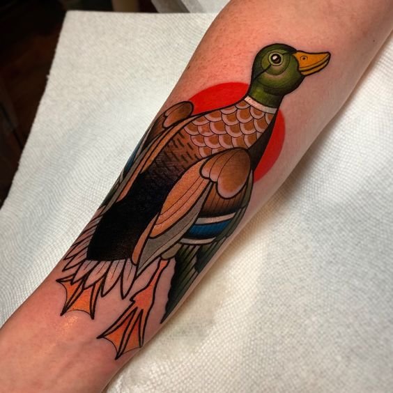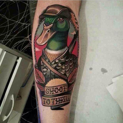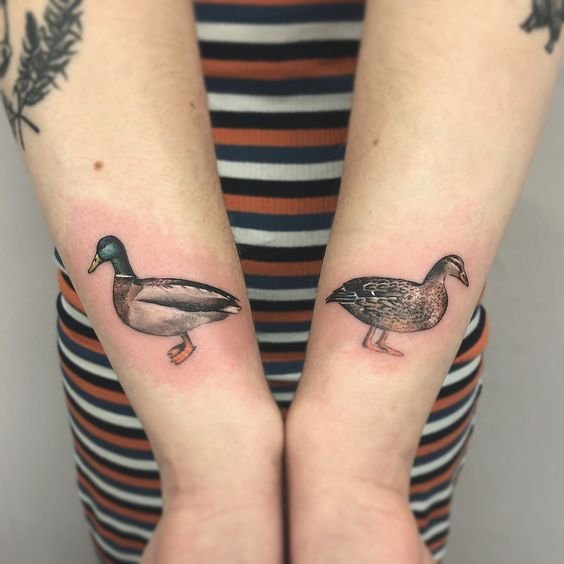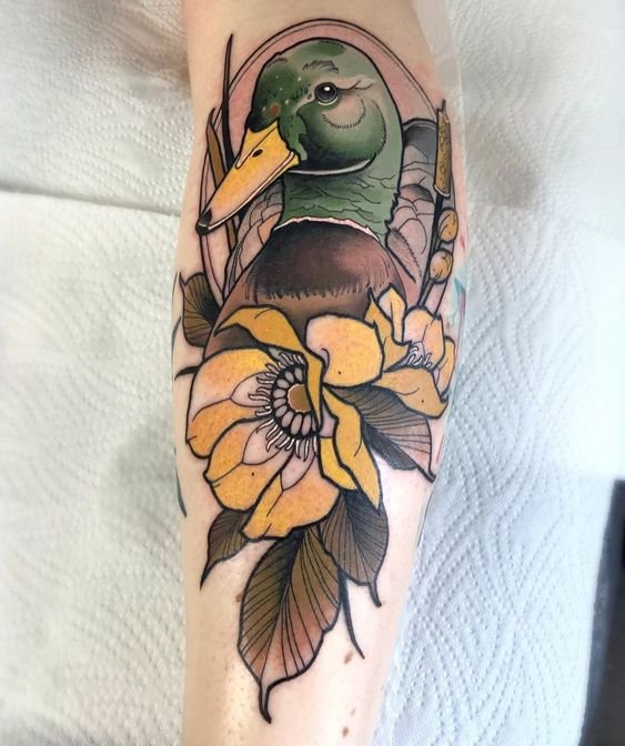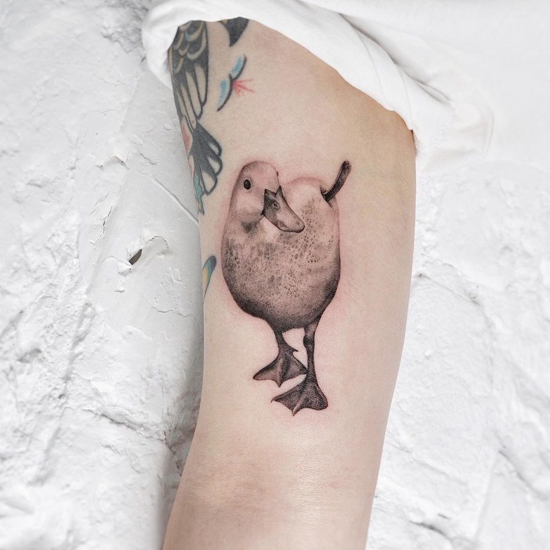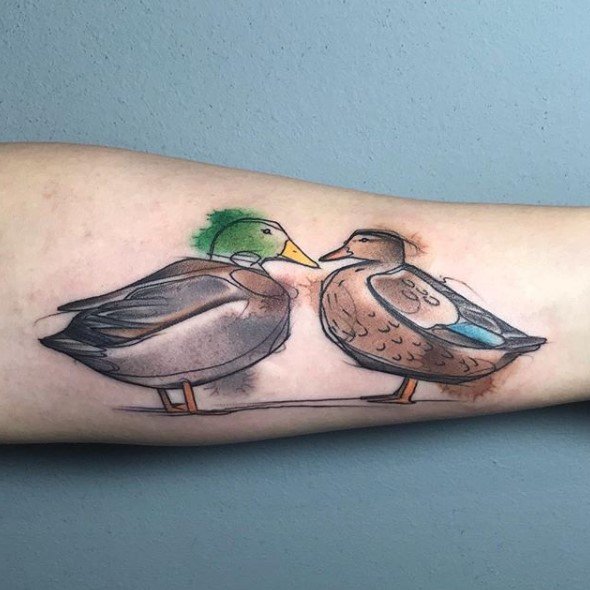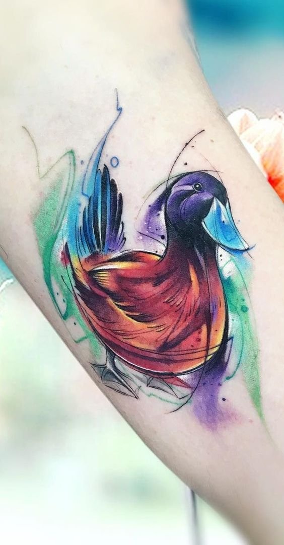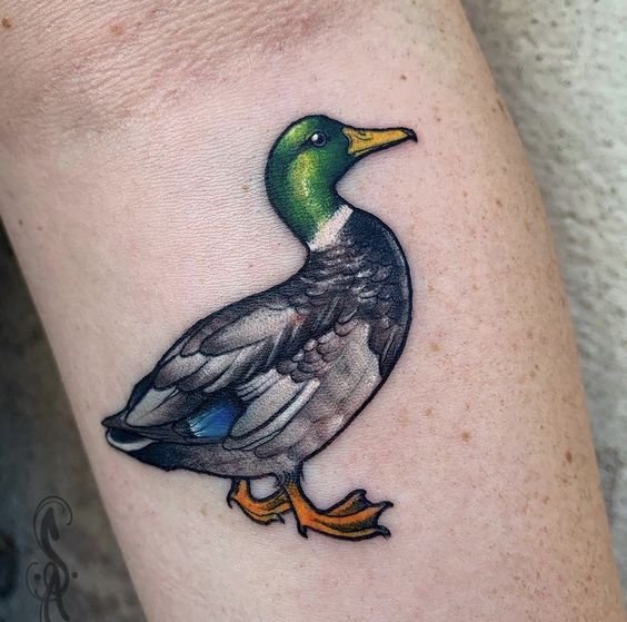 A kacsa tetováló képét kis és meglehetősen nagy léptékben alkalmazzák. A tetoválás legalkalmasabb helye a váll vagy az alkar, a láb, a kar. Ennek a madárnak a kis képeihez a csukló vagy a nyak tökéletes.
