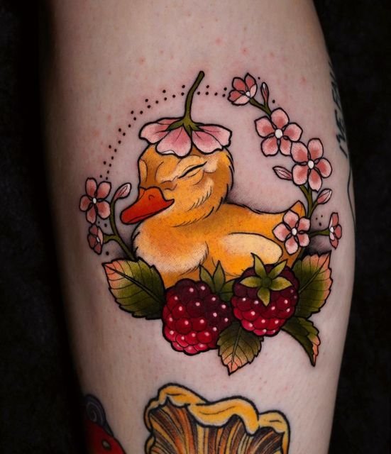 A kis gumikacsa tetoválása a gondatlanságot és a bizonytalanságot szimbolizálja, ezért a tetoválás tulajdonosai gyakran emlékeznek gyermekkorukra. Egy ilyen tetoválási vázlat azt sugallja, hogy az ember megenged magának mindenféle csínyt, és szeret bolondozni.