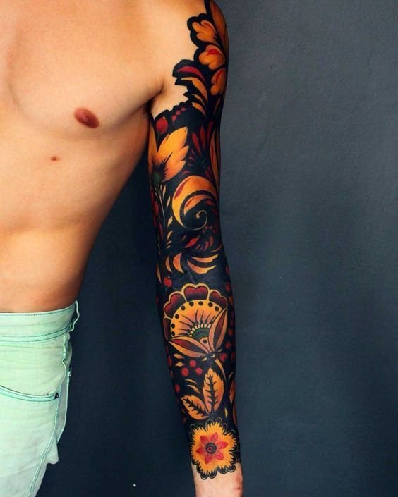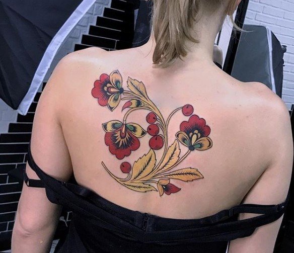 A Khokhloma tetováláshoz általában széles területre van szükség, hogy a minták teljes mértékben átadják teljes értelmezésüket, és látványosan nézzenek ki.
