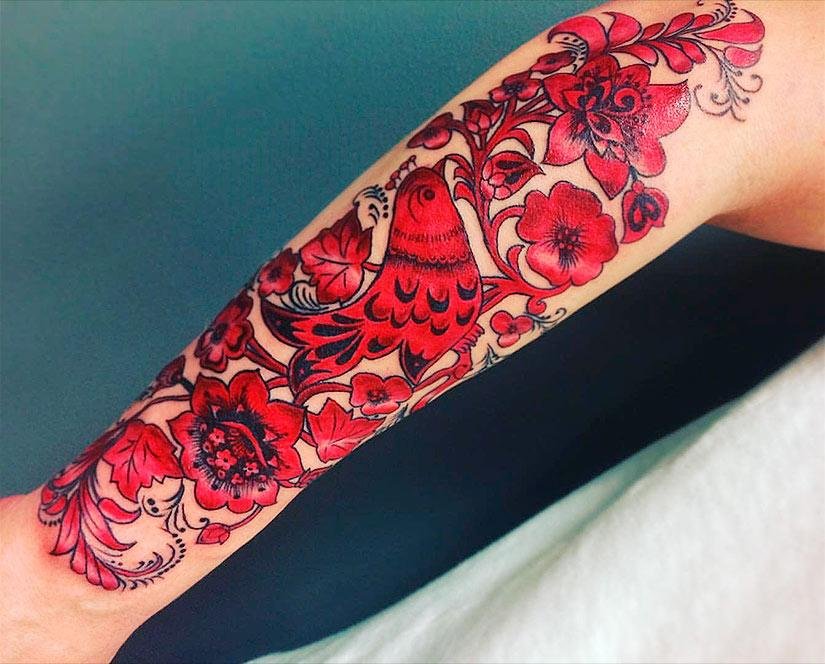 A Khokhloma festéssel készült tetoválás különleges készségeket igényel, amikor a tetoválás mesterét választja, először nézze meg a portfólióját az összes munkával. Egy tetováló művész, aki nem jártas a Khokhloma alkalmazásában, csak elronthatja a megjelenését. Egy tapasztalt pedig kitűnő festési kivitelezést készít, amely élénk, színes színeivel egy életre elragadtatja Önt.