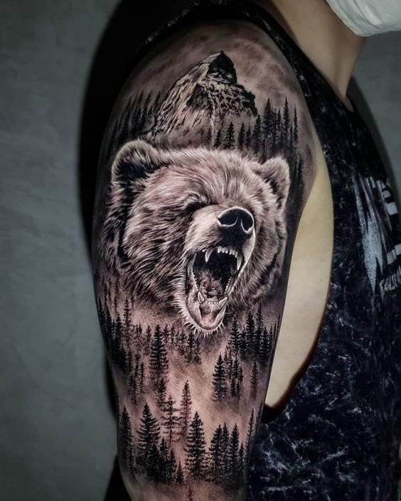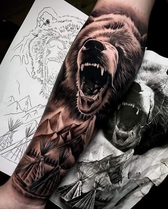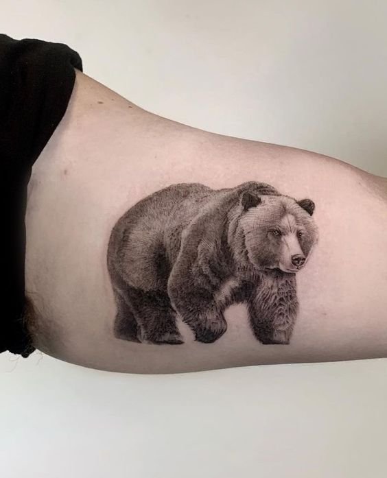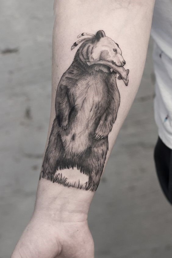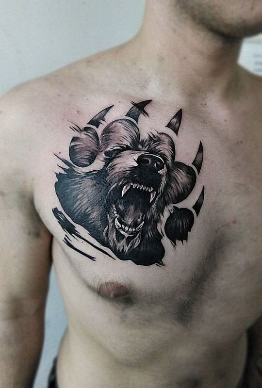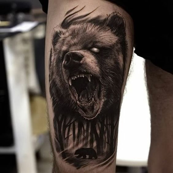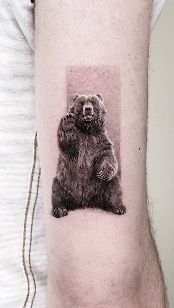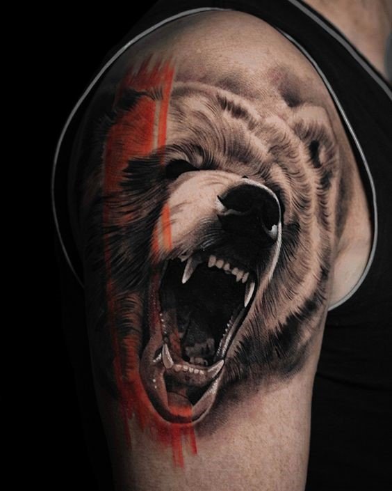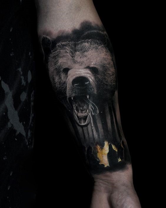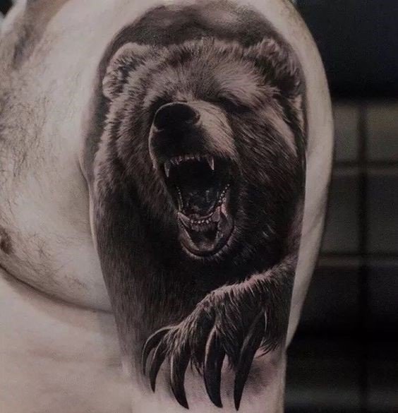 Grizzly tetoválás. Ez a kép az ember eltökéltségéről beszél, valamint arról, hogy képes megbirkózni az élet bármely nehézségével, erős karaktere van, és képes kiállni önmagáért.