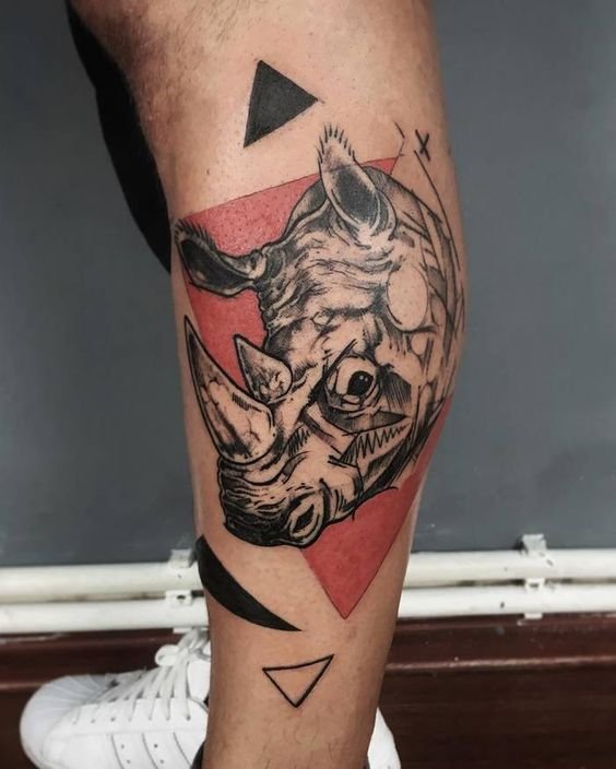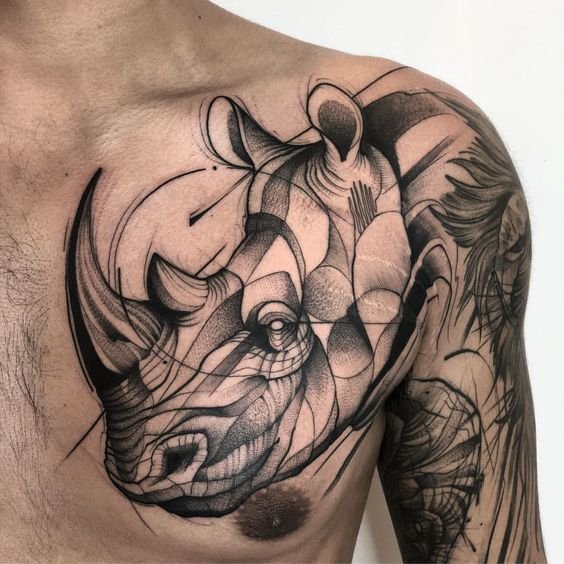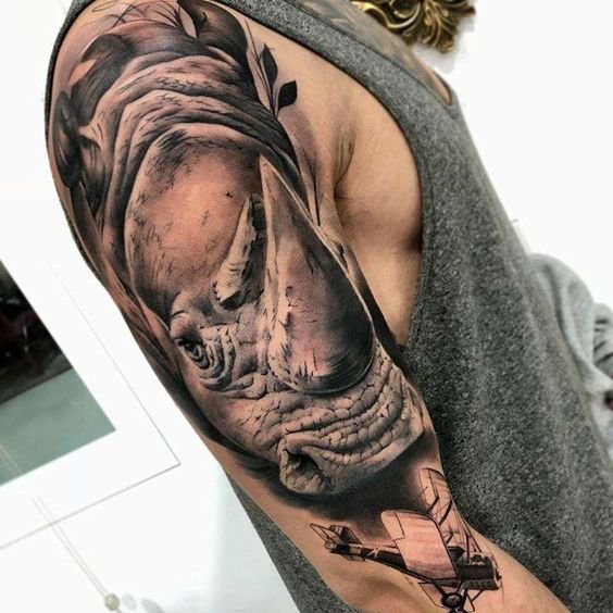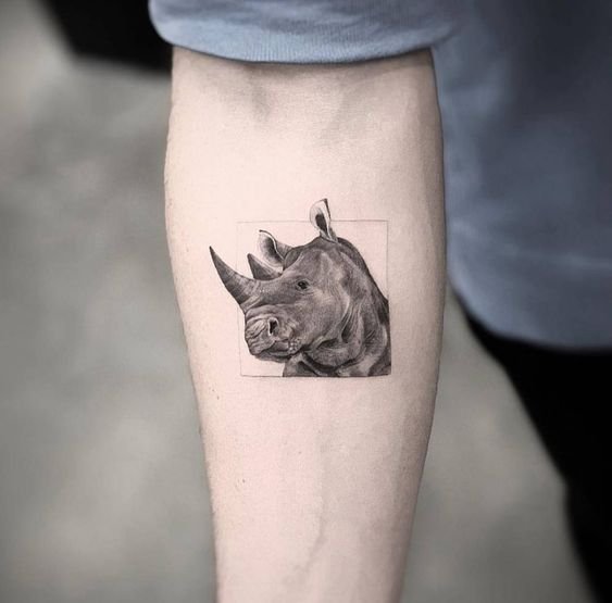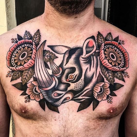 A legtöbb esetben egy orrszarvú képével ellátott tetoválást alkalmaznak egy férfi bőrére.