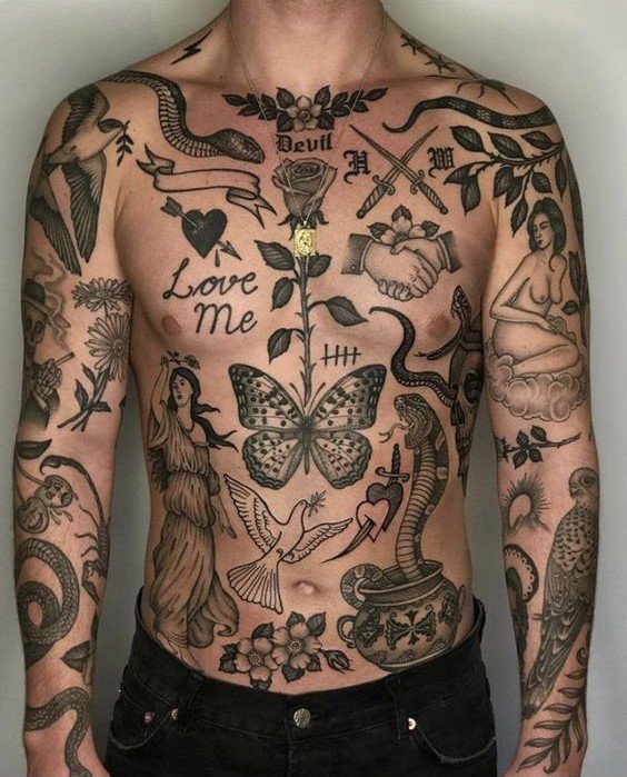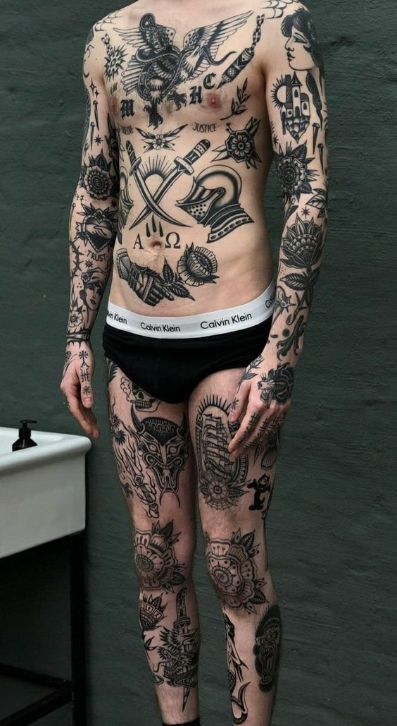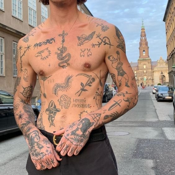 Valójában ez egy módszer a vázlatok testre helyezésére. Amikor a legtöbb ember hüvelyt készít, egyetlen nagy, tömör szövetdarabot kap. Míg a patchwork a kis és közepes méretű tetoválások patchwork elrendezésének technikája, amelyek szorosan illeszkednek egymáshoz, de ugyanakkor nem érintkeznek. Más szóval, ez egy csomó kis kép, amelyek kollázsba vannak összerakva, köztük egy kis üres hely, mint foltok a farmerkabáton. Nem feltétlenül van szükségük olyan témára, amely egyesítené a tetoválást. És általában nincs háttér, hogy kitöltse a teret. Vizuálisan olyan, mintha minden tetoválás egy matrica vagy tapasz lenne, amelyet a testére ragasztottak.