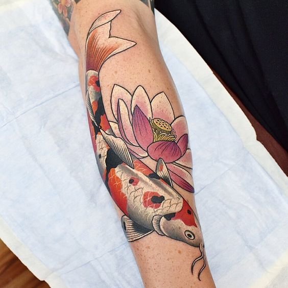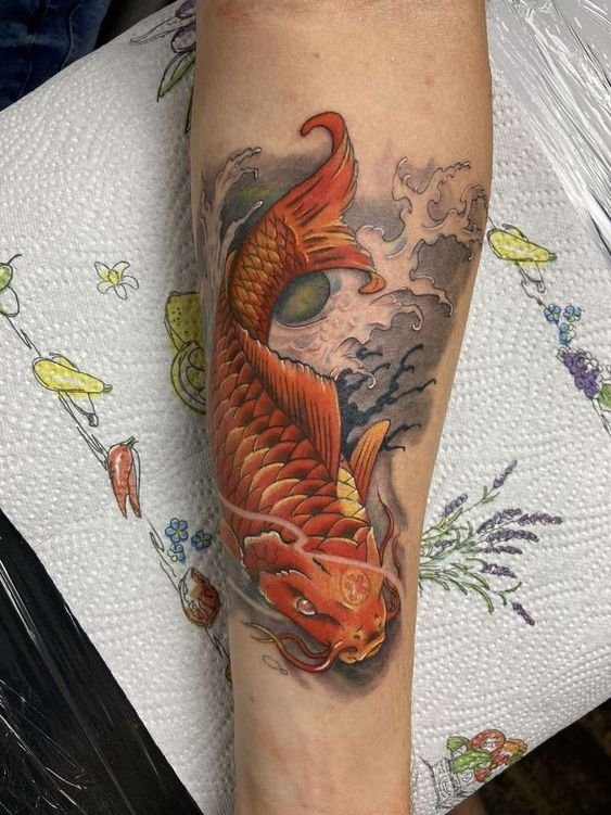 Az árammal szembemenő koi jelzi a tetoválás tulajdonosának útját a cél felé. Az úszó hal a megoldott probléma jele.