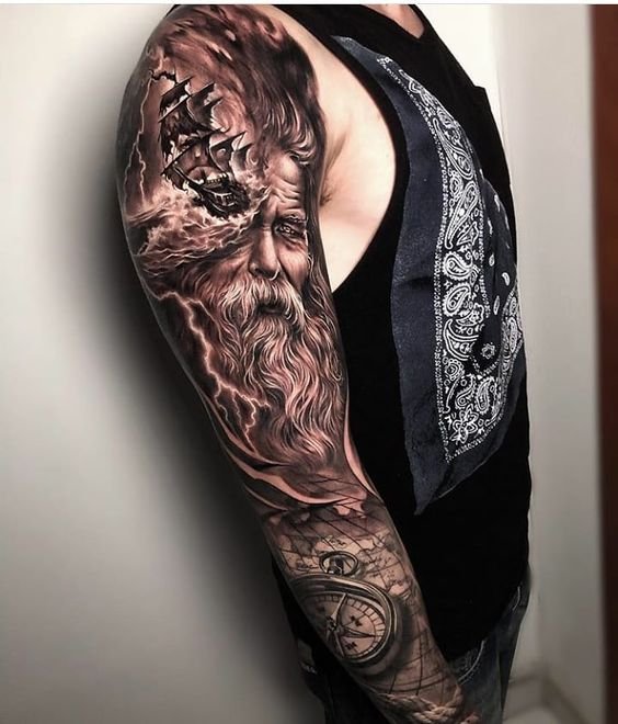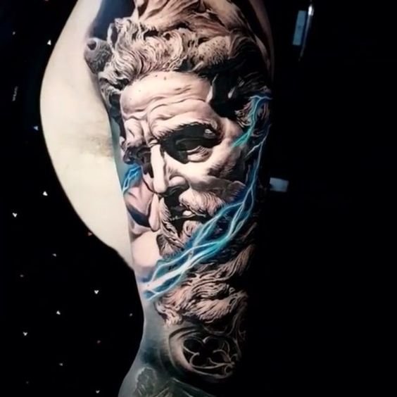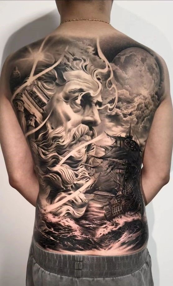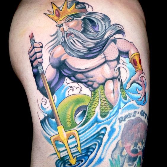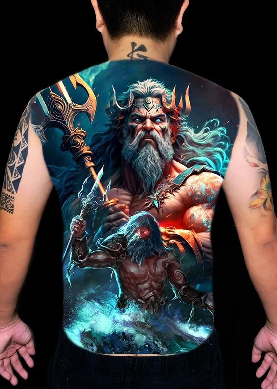 A Poseidon tetoválási vázlata színességével, erejével és nagyszerűségével hívja fel magára a figyelmet.