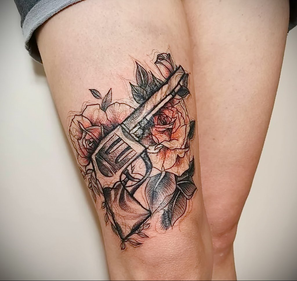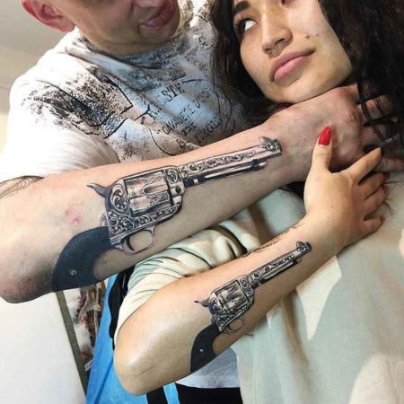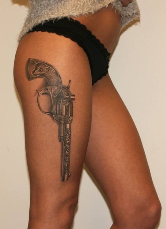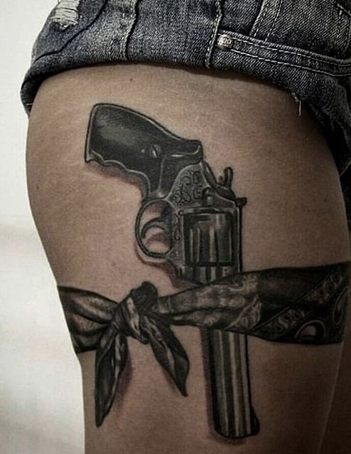 Ez a kép egyformán lenyűgöző a férfi testen és a törékeny női testeken. A kivitelezésben a fő különbségek a forma és a színpaletta. A testképek segítségével a szép nem igyekszik hangsúlyozni kecsességét és szépségét. Ezért a nők testén leggyakrabban kis revolvereket helyeznek el, különböző színekben, sok mintával és egyéb elemekkel. A revolverrel ellátott tetoválás tökéletesen hangsúlyozza a tulajdonos szexualitását, különösen, ha áttört harisnyakötővel párosul. Egy ilyen testkép önbizalmat ad a lánynak, és kiemeli. Ami a revolvert ábrázoló férfiképet illeti, az erősebb nem a nagyméretű fegyvereket részesíti előnyben, pontos részletekkel, valósághű formában.