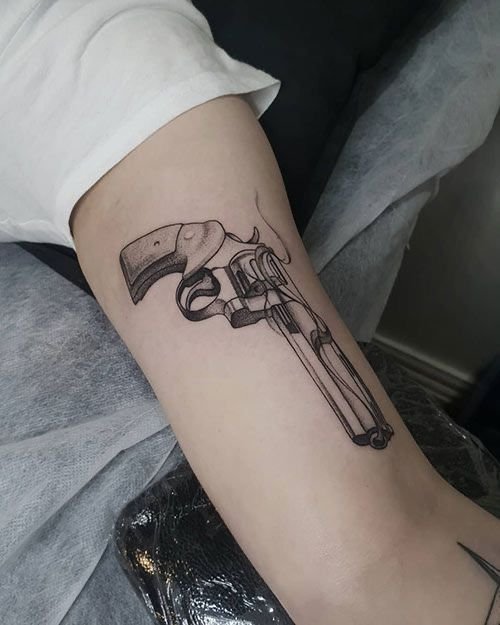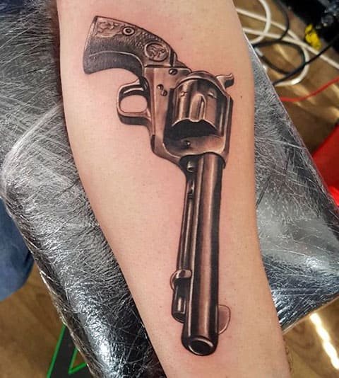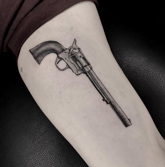 A tetoválásokhoz leggyakrabban olyan revolvereket választanak, mint a Colt, a Spiller & Barr és a Remington. Az utolsó lehetőséget a vázlatokban meglehetősen ritkán használják. A revolver testképe nagyon vonzónak tűnik, és a hideg számítás és az erő megjelölését hordozza.