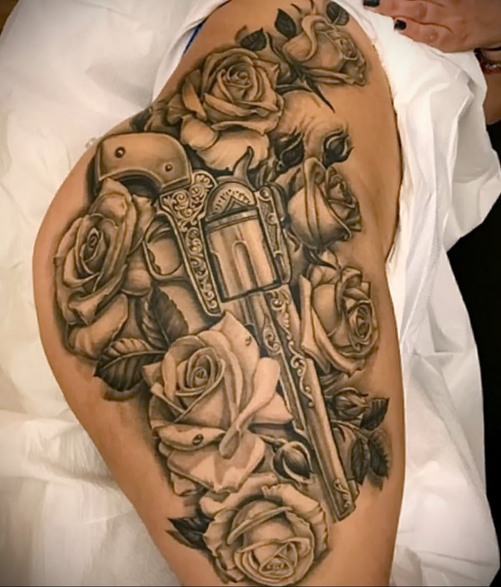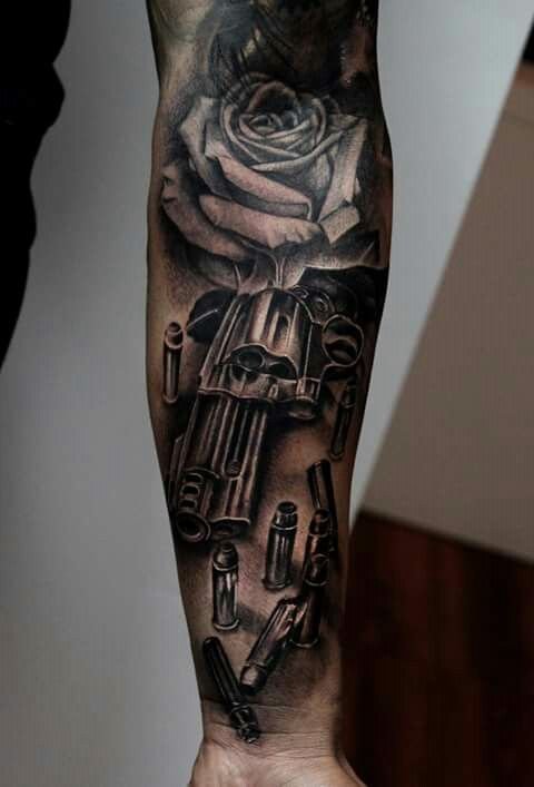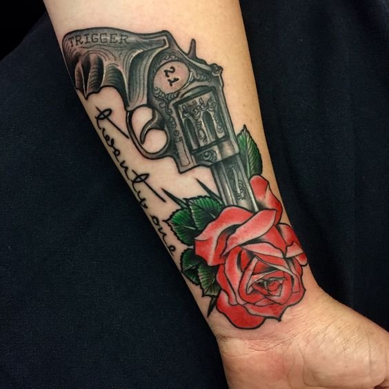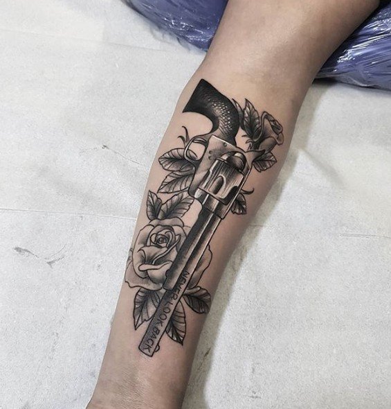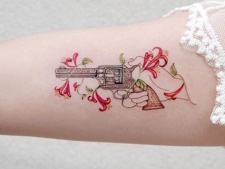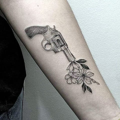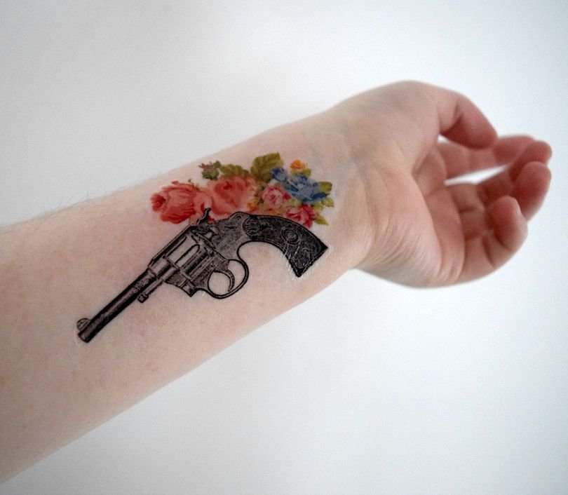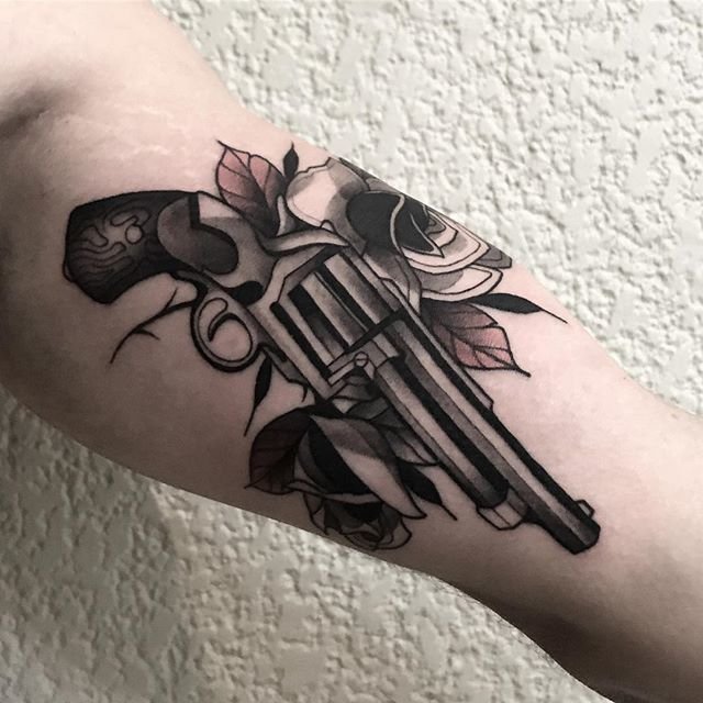 A rózsával, rózsákkal díszített revolver tetoválás halálos vagy veszélyes szépséget jelöl. Az ilyen képek gyakran Old School stílusban készülnek.