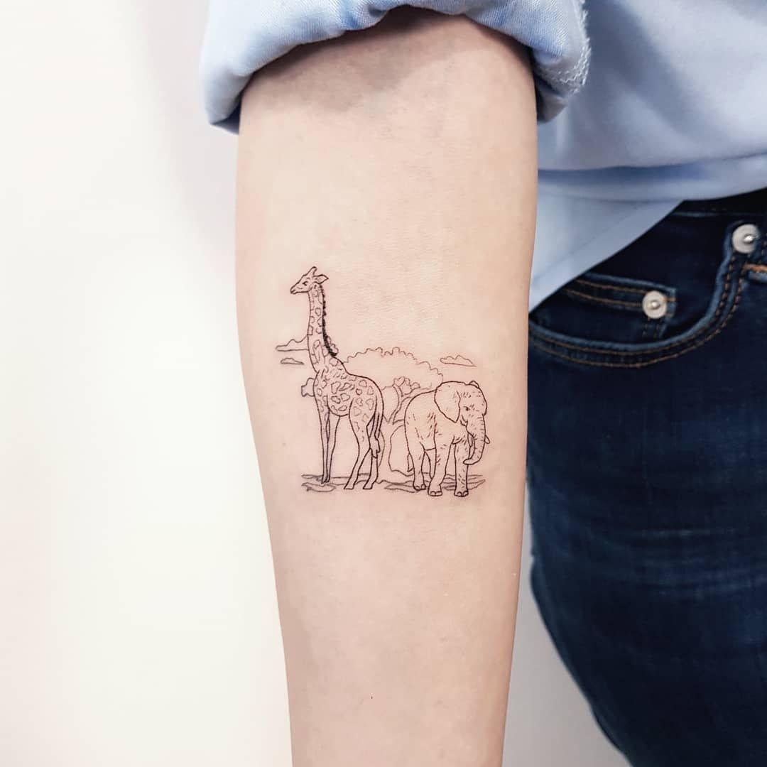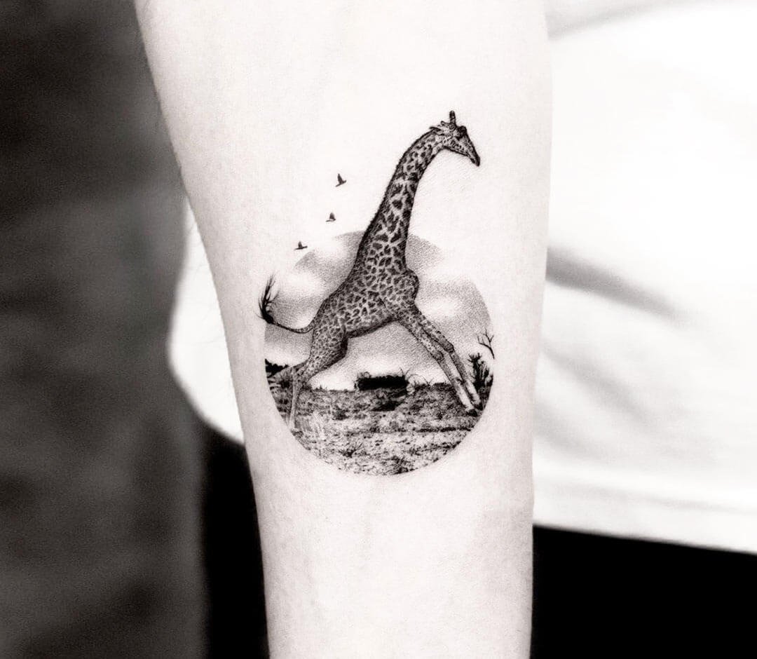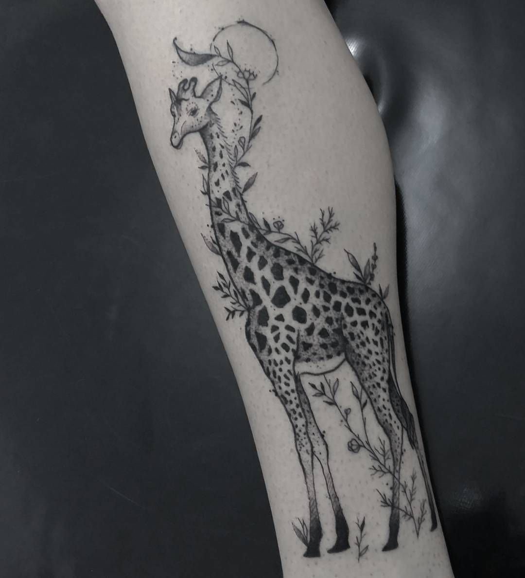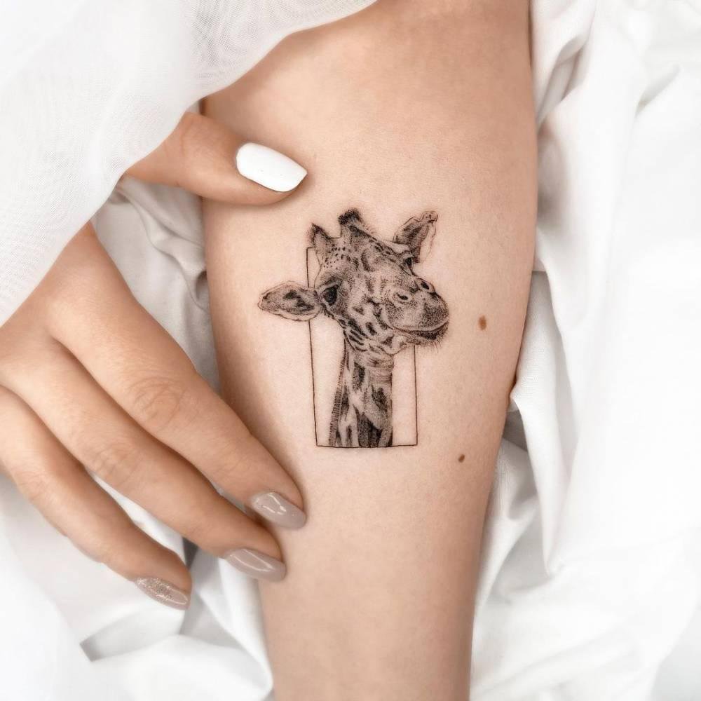 Ez lehet egy zsiráf valósághű képe vagy rajzfilmfigurája. Általában a zsiráfot a szokásos élőhelyén ábrázolják, de mivel a fantáziának nincsenek határai, a tetoválás cselekménye nagyon eltérő lehet. Minden a tetováló mester végzett általános munkájától függ. Egy ilyen tetoválás tökéletes mind a lányok, mind a fiuk számára.