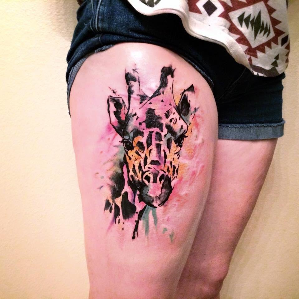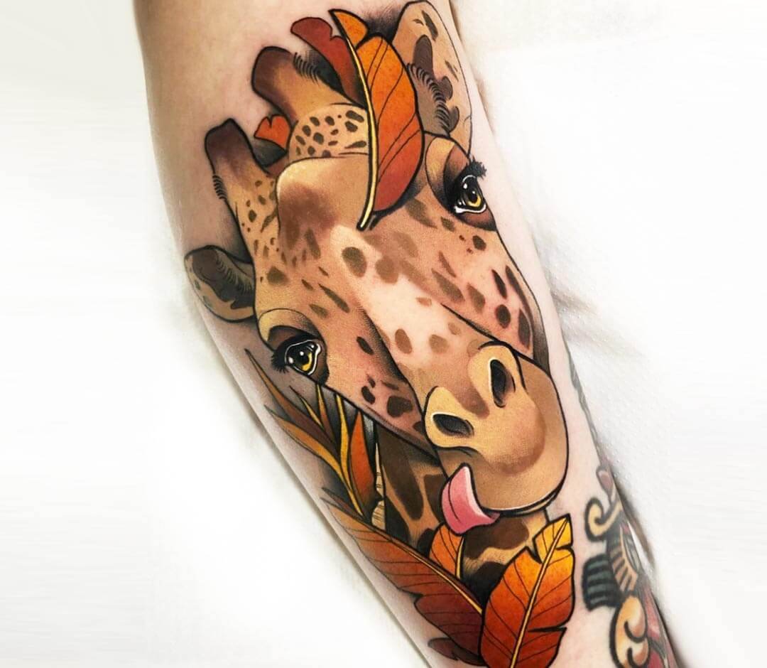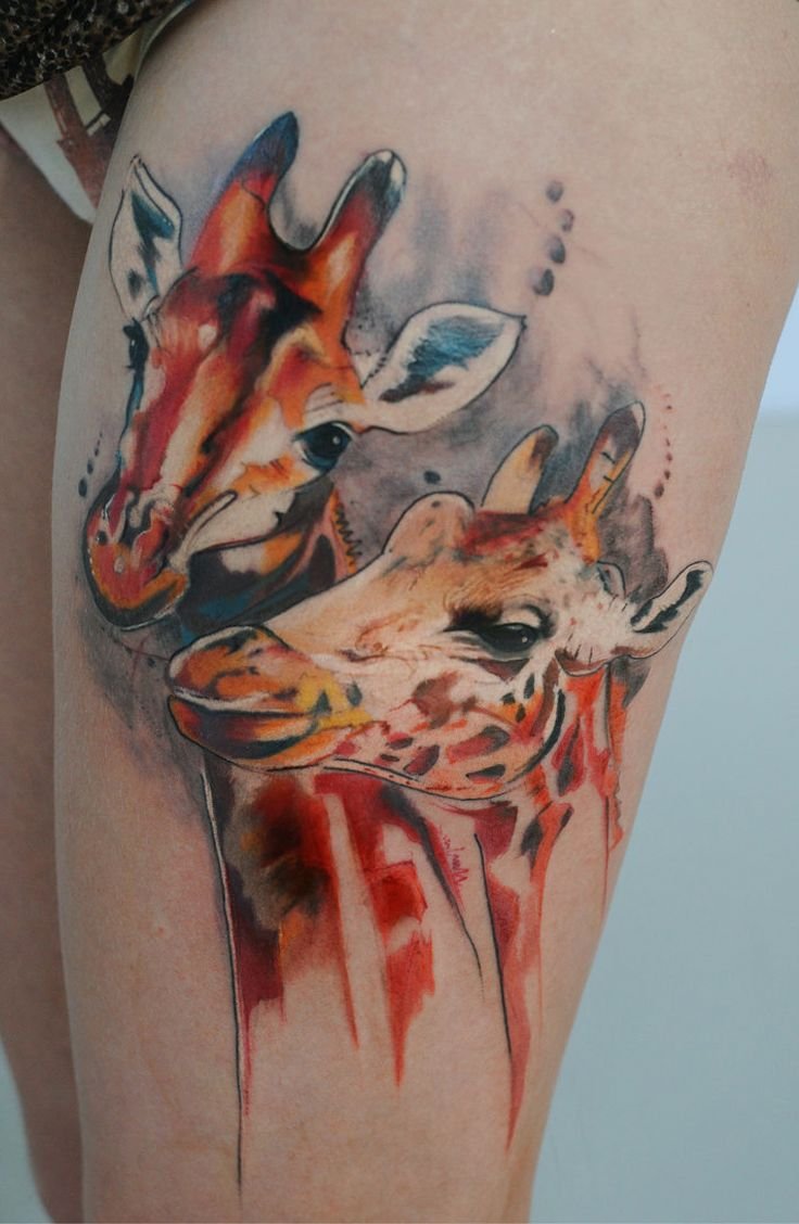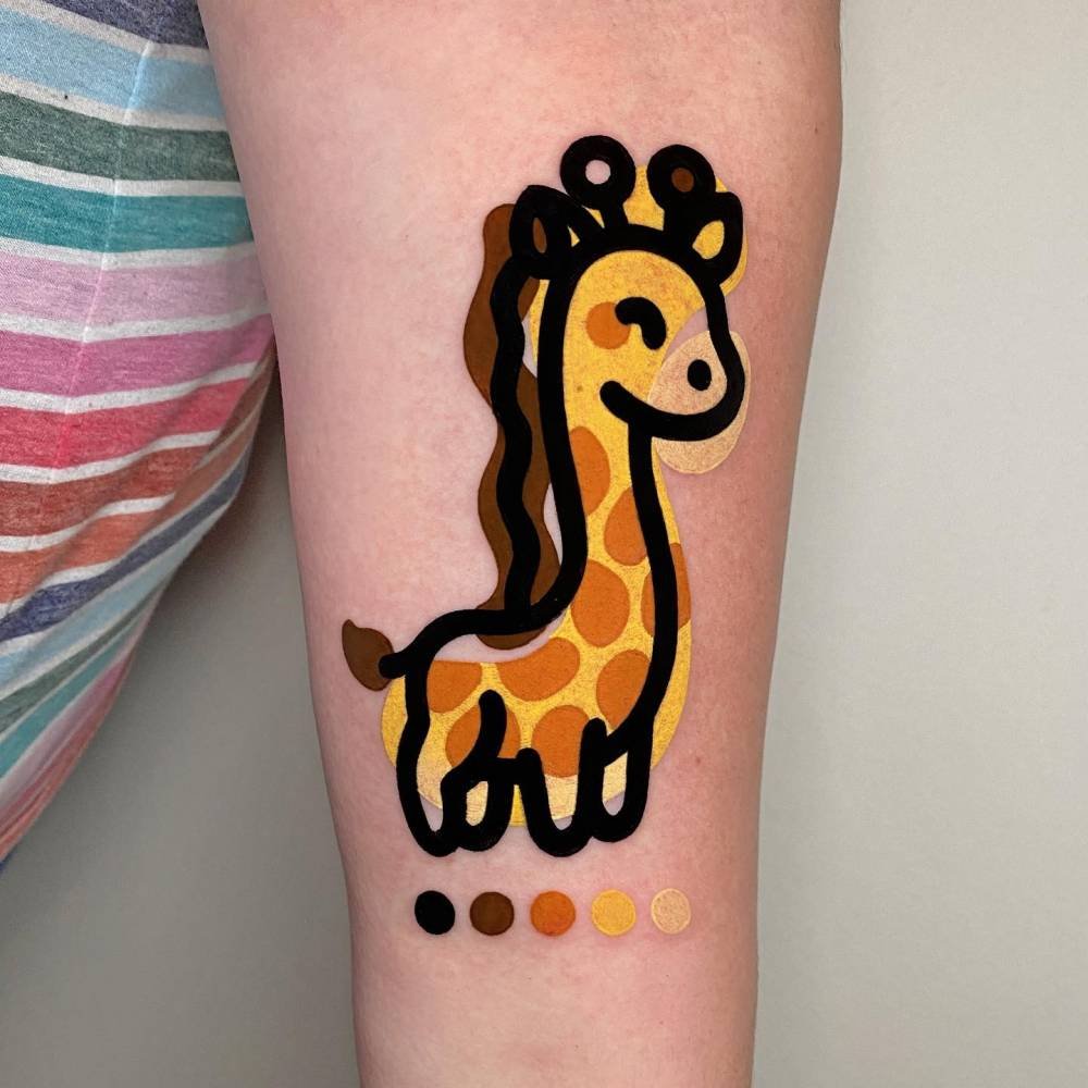 A zsiráf tetoválás nemcsak egyedi, hanem színes is, bármilyen bőrtónushoz alkalmas. Egyébként a zsiráf testén lévő foltok mindig egyediek, akár az emberi ujjlenyomatok.