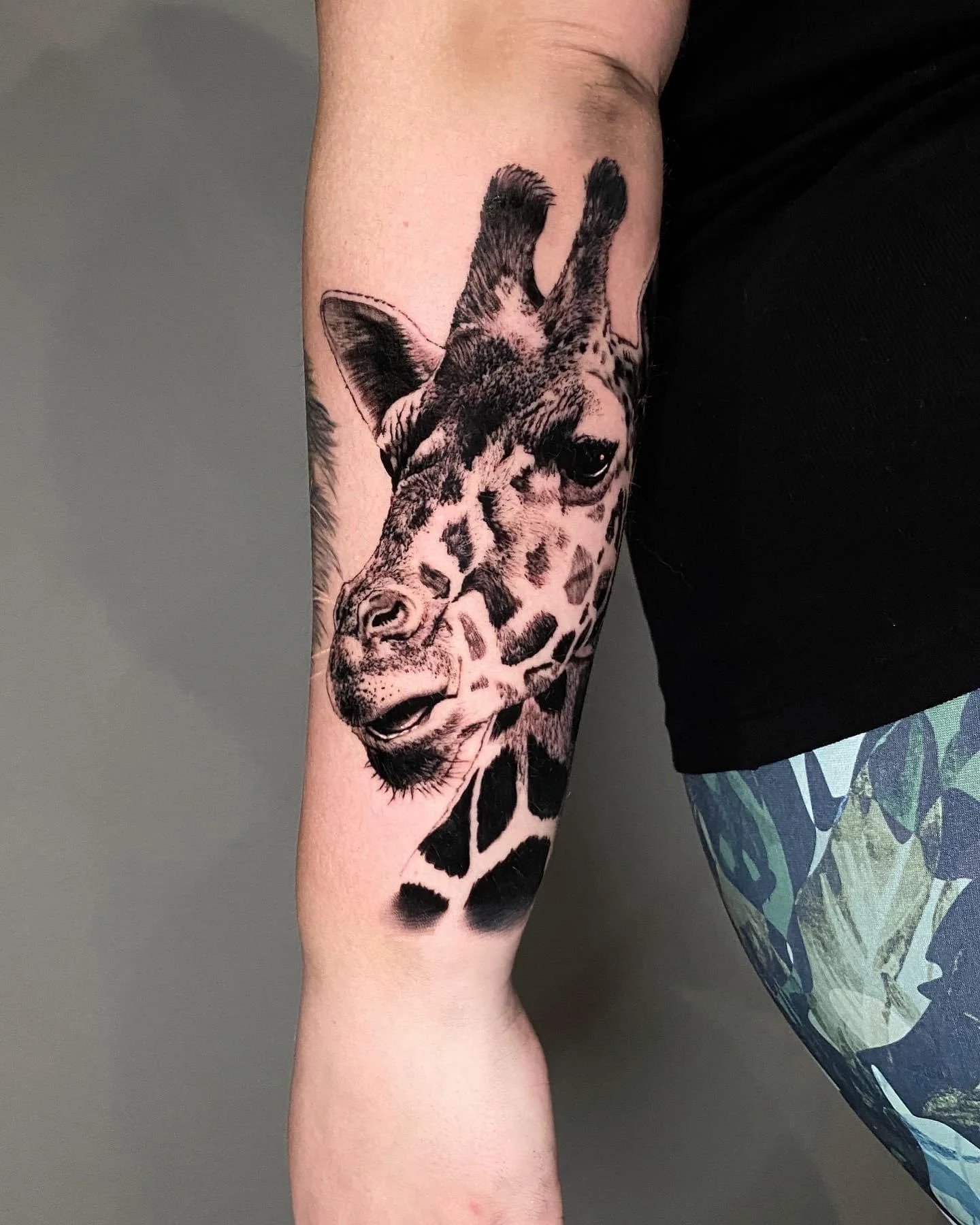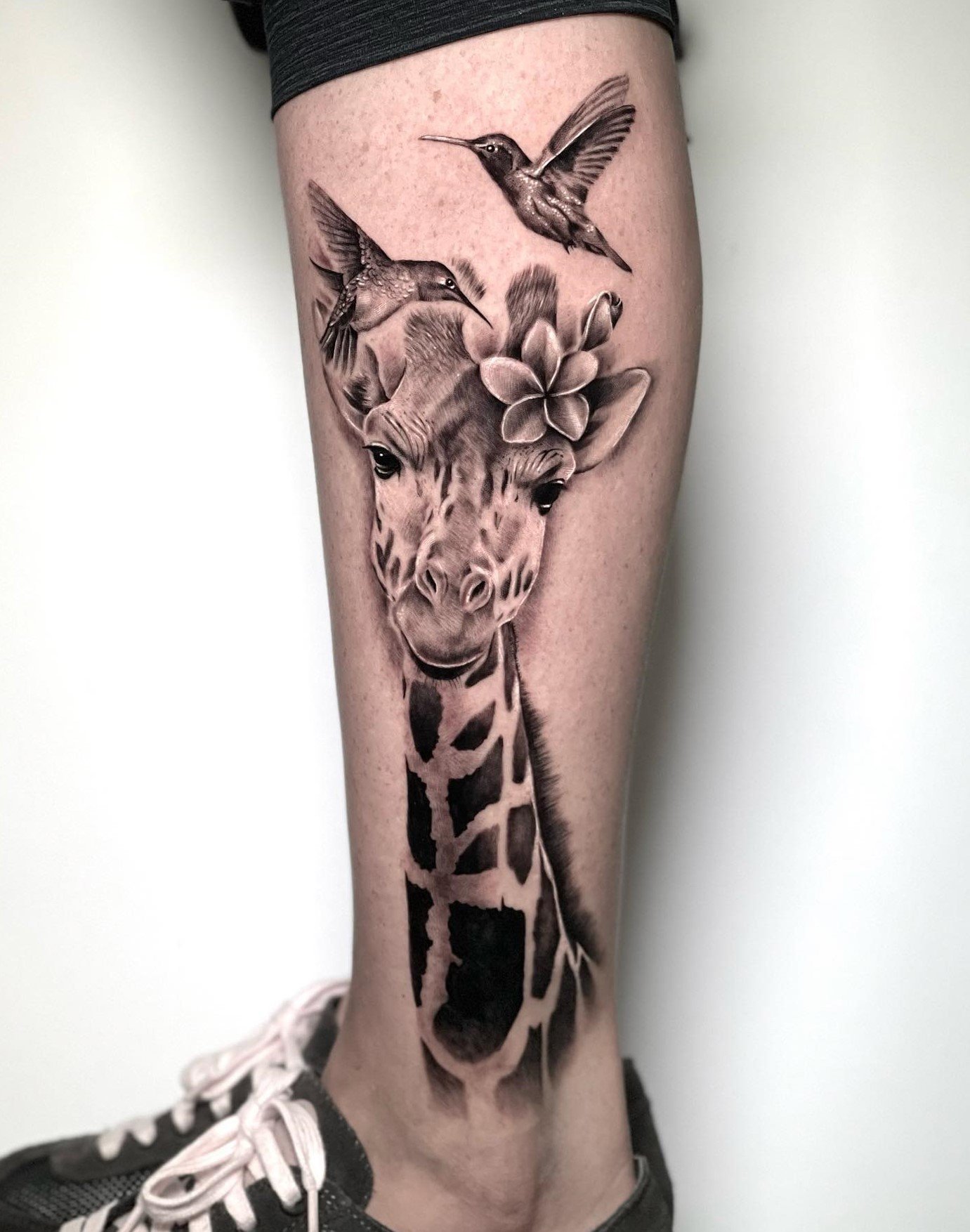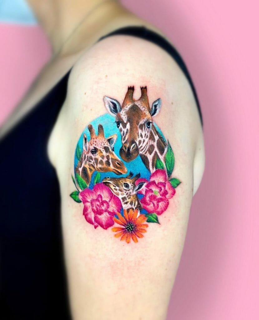 A zsiráf tetoválás nemcsak egyedi, hanem színes is, bármilyen bőrtónushoz alkalmas. Egyébként a zsiráf testén lévő foltok mindig egyediek, akár az emberi ujjlenyomatok.